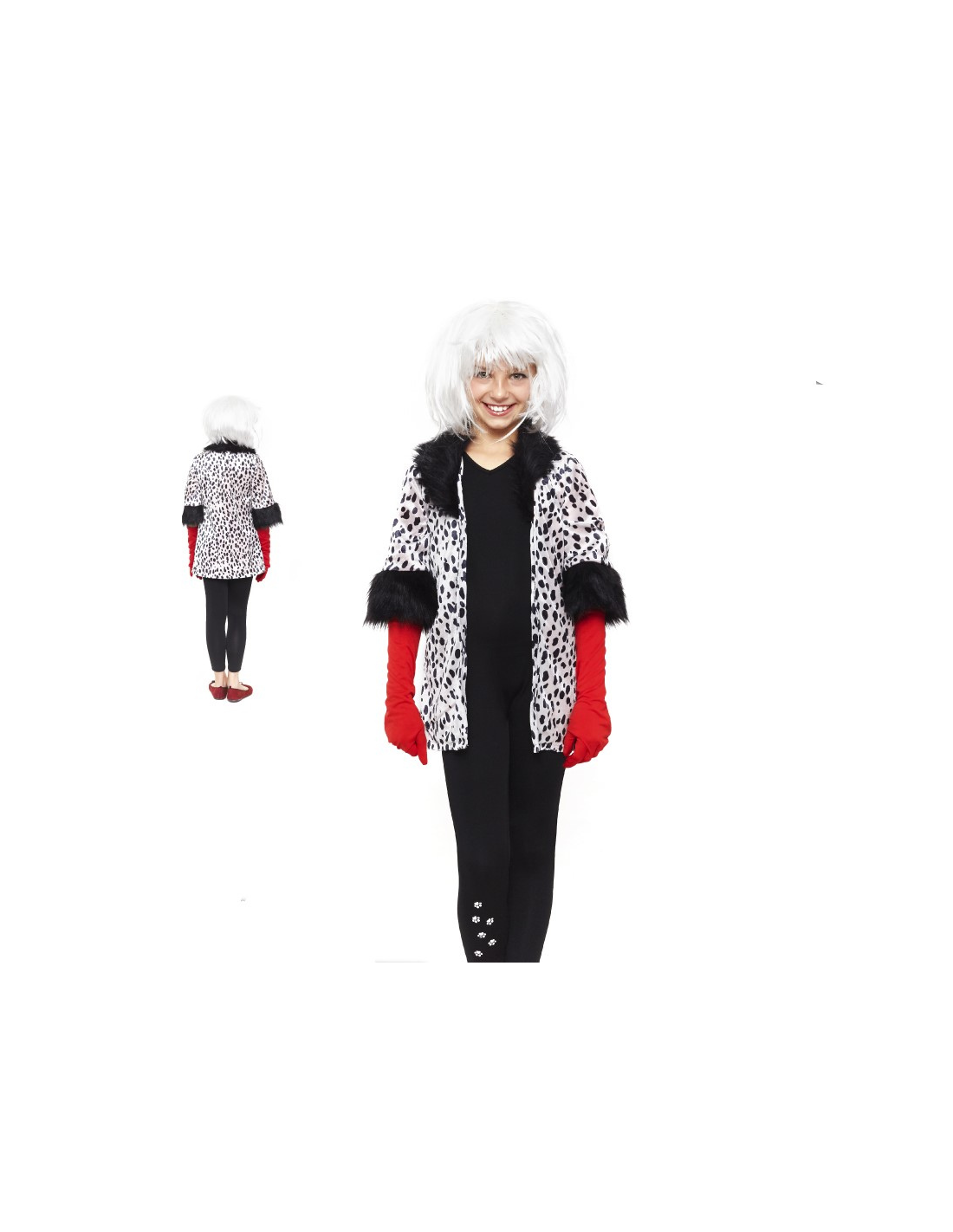Disfraz Cruela de Vil infantil que incluye mono, chaqueta y guantes.