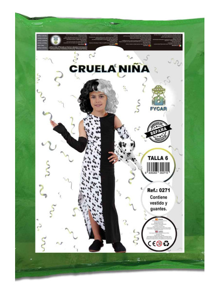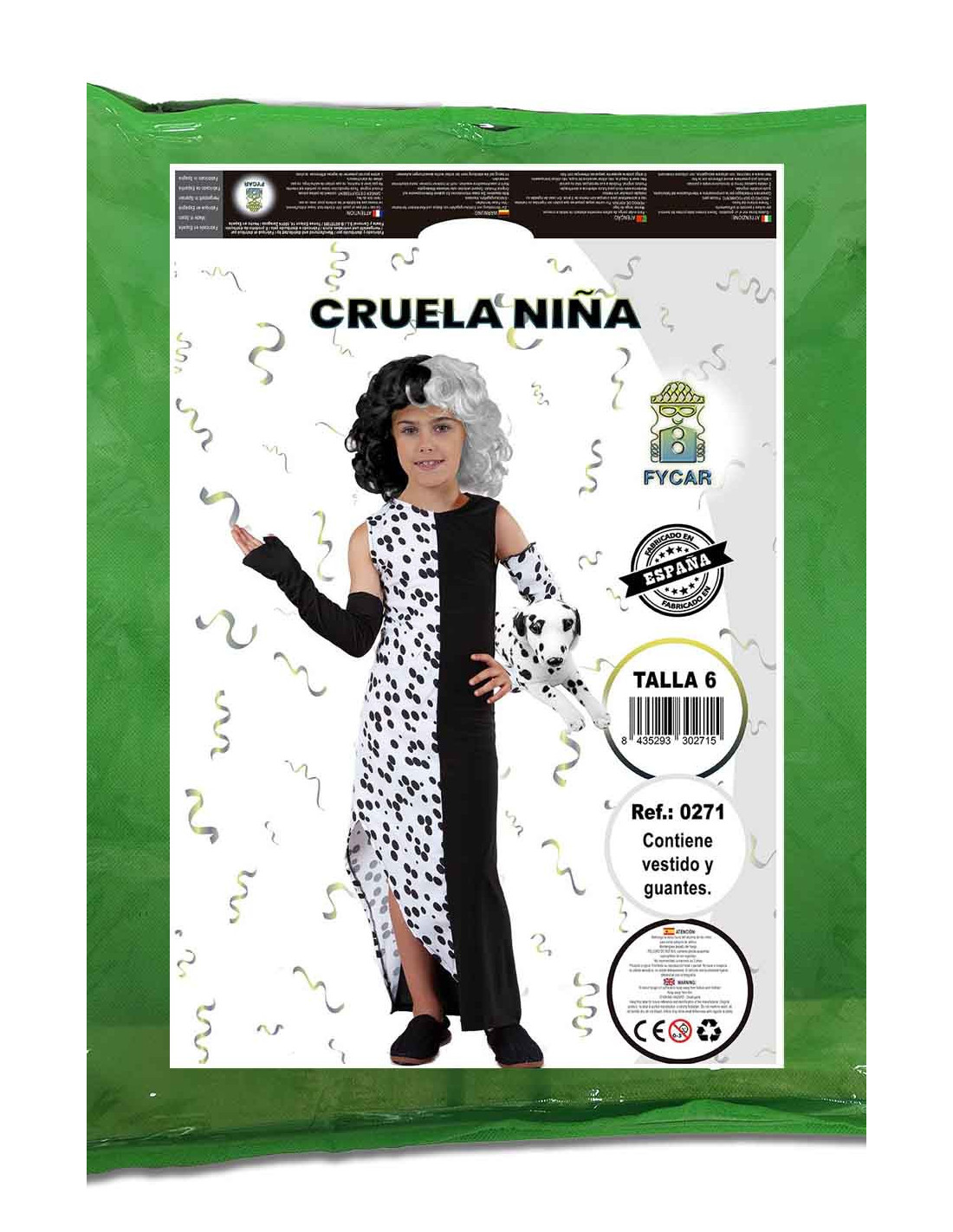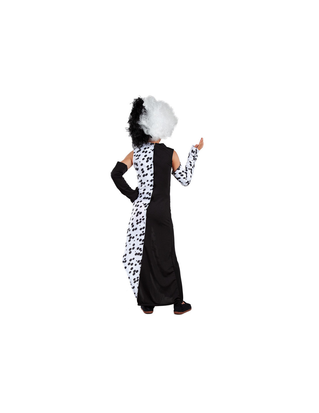 Disfraz Cruela de Vil para niña que incluye vestido y guantes.
