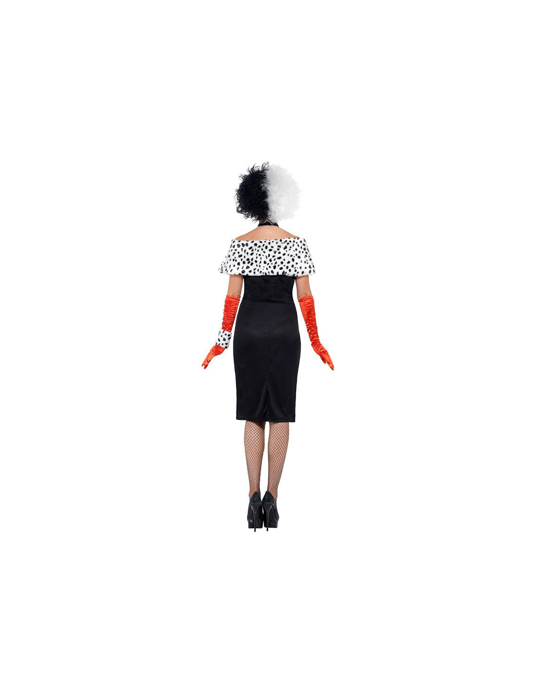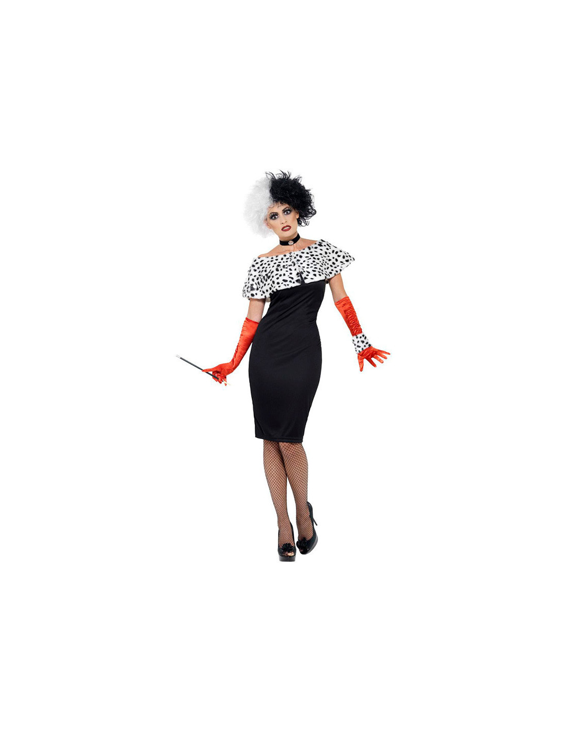 Disfraz Cruella deluxe para mujer que incluye vestido, guantes, torera, muñequera y gargantilla.
