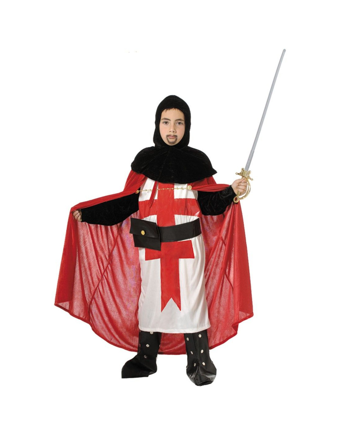 disfruta con tus amigos recreando el mundo de los cruzadas medievales con este disfraz autentico de cruzado, Incluye túnica, capa, capuchón, cinturón y cubrebotas. Tallas 6, 8 y 12