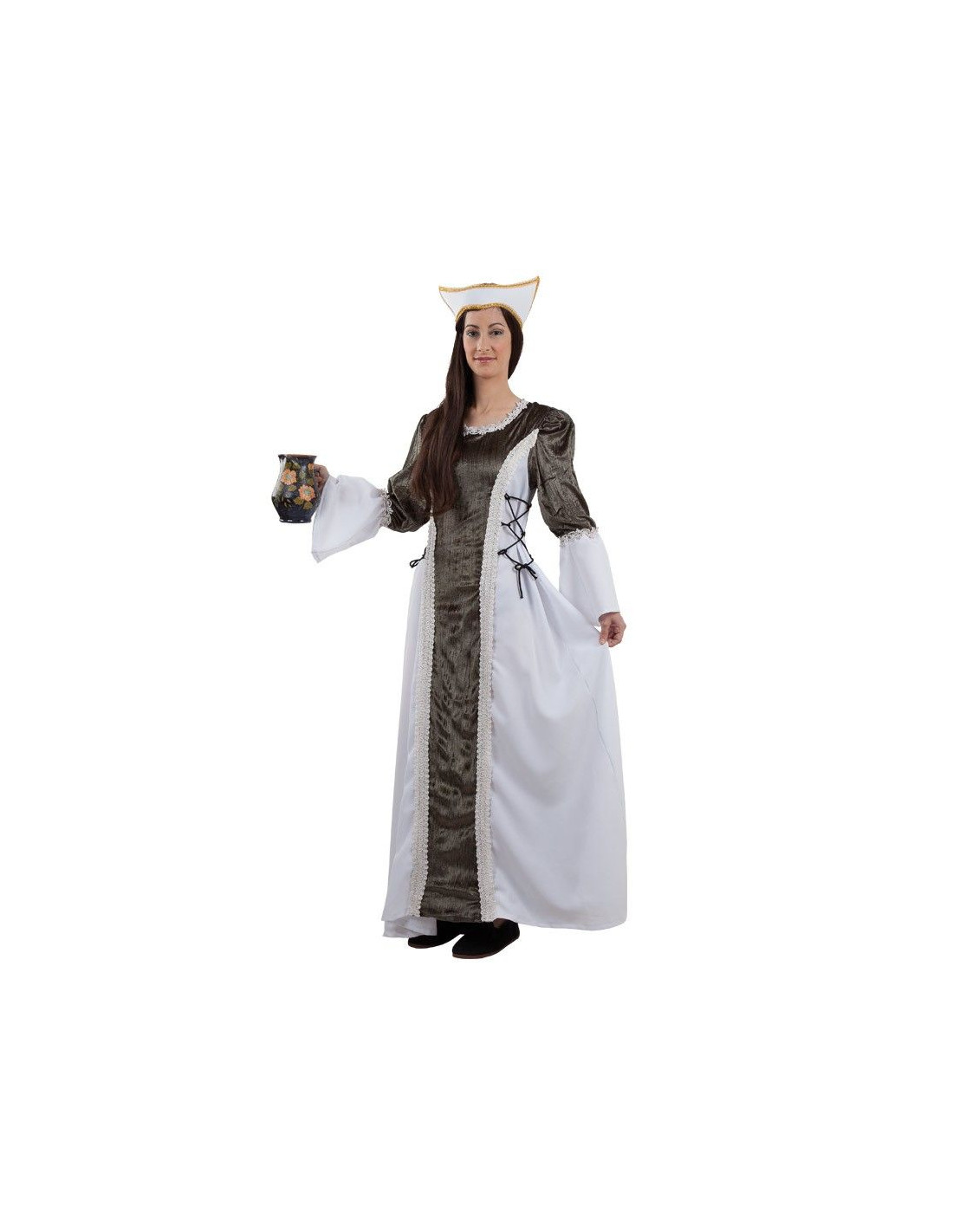 Disfraz dama medieval Isabel para convertirte en un ciudadano más de la Edad Medieval. Ideal para ferias y eventos medievales. Incluye vestido y tocado.