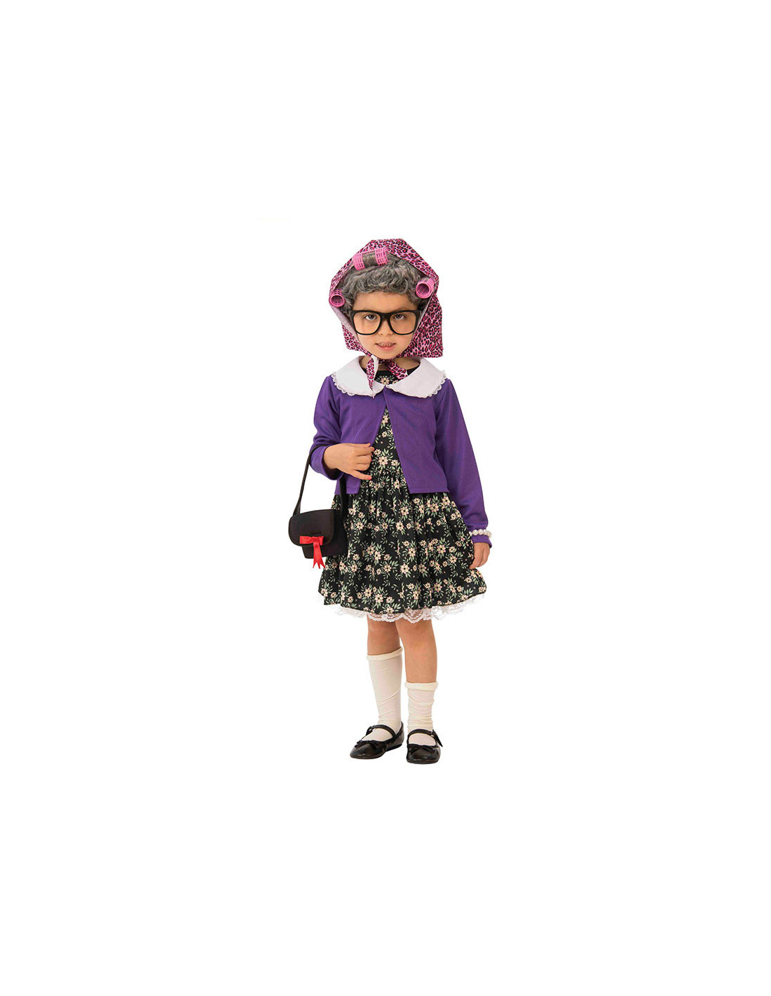 El disfraz de abuela para niña contiene vestido, chaqueta morada y peluca canosa con rulos y pañuelo rosa.