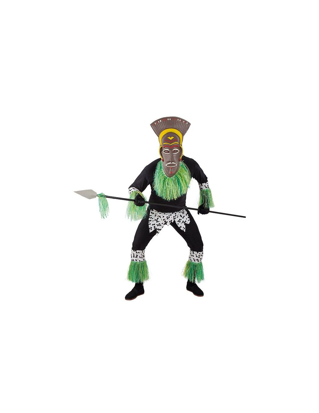 Disfraz de africano para hombre con el que podrás casarte por una de las ceremonias ancestrales más conocidas del mundo. Perfecto para disfrazarse en grupo o pasarlo en grande este Carnaval, el disfraz de africano para hombre está compuesto por una máscara tribal fabricada en goma eva, un mono negro enterizo con decoraciones de tiras verdes y zonas estampadas en blanco y negro, y taparrabos.