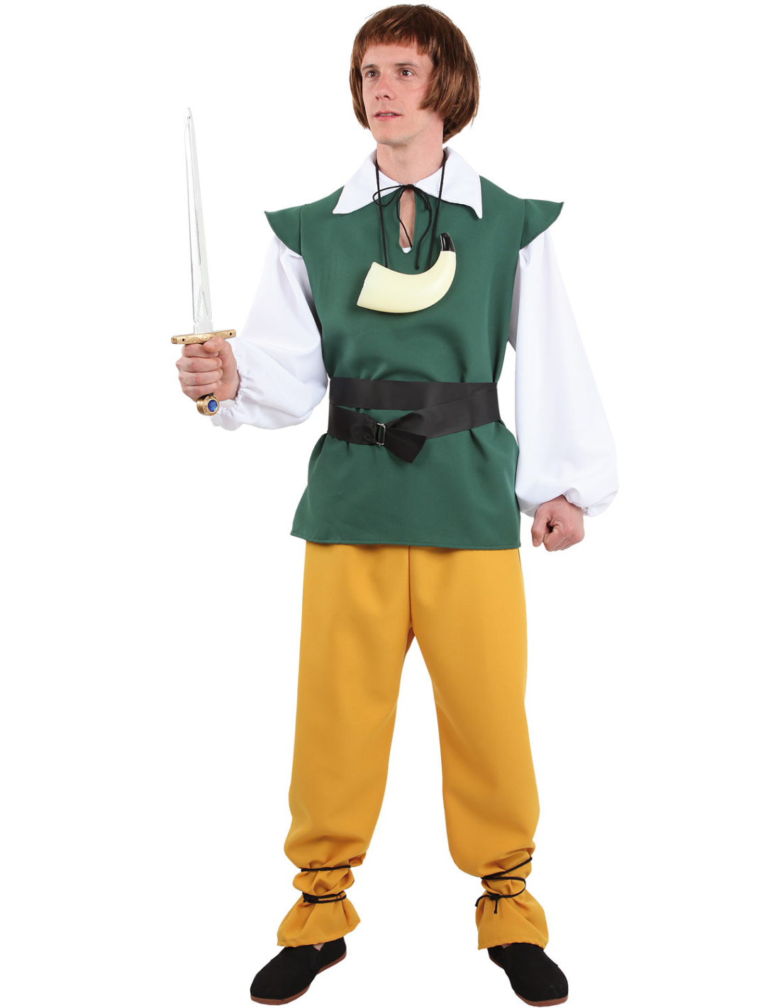 Disfraz Aldeano medieval hombre que incluye casaca verde con mangas y cuello blanco, pantalon color mostaza con cordones en los tobillos para ajustarlo, cinturon doble vuelta y cuerno de plastico.