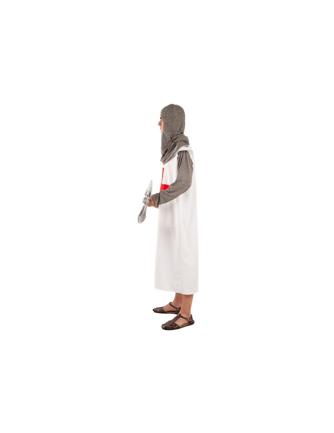 El disfraz de artillero medieval hombre contiene una túnica negra con una cruz roja en el pecho, mangas grises y una abertura frontal para que se más cómodo caminar y moverte. También incluye una capucha gris del mismo tejido que las mangas simulando una cota de malla.