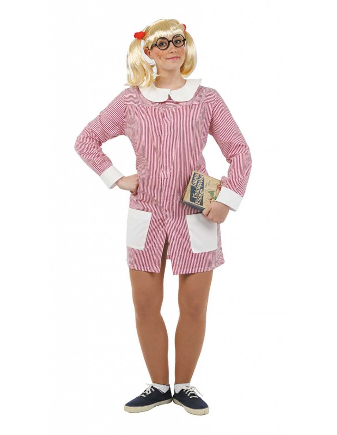 Disfraz de bata colegiala para reconstruir tu infancia y hacer mil y una trastadas. Incluye bata a rayas rosas y blancas con cuello, bolsillo y puños en blanco. Disponemos de bata colegiala de hombre para disfrazarse en pareja o grupos.