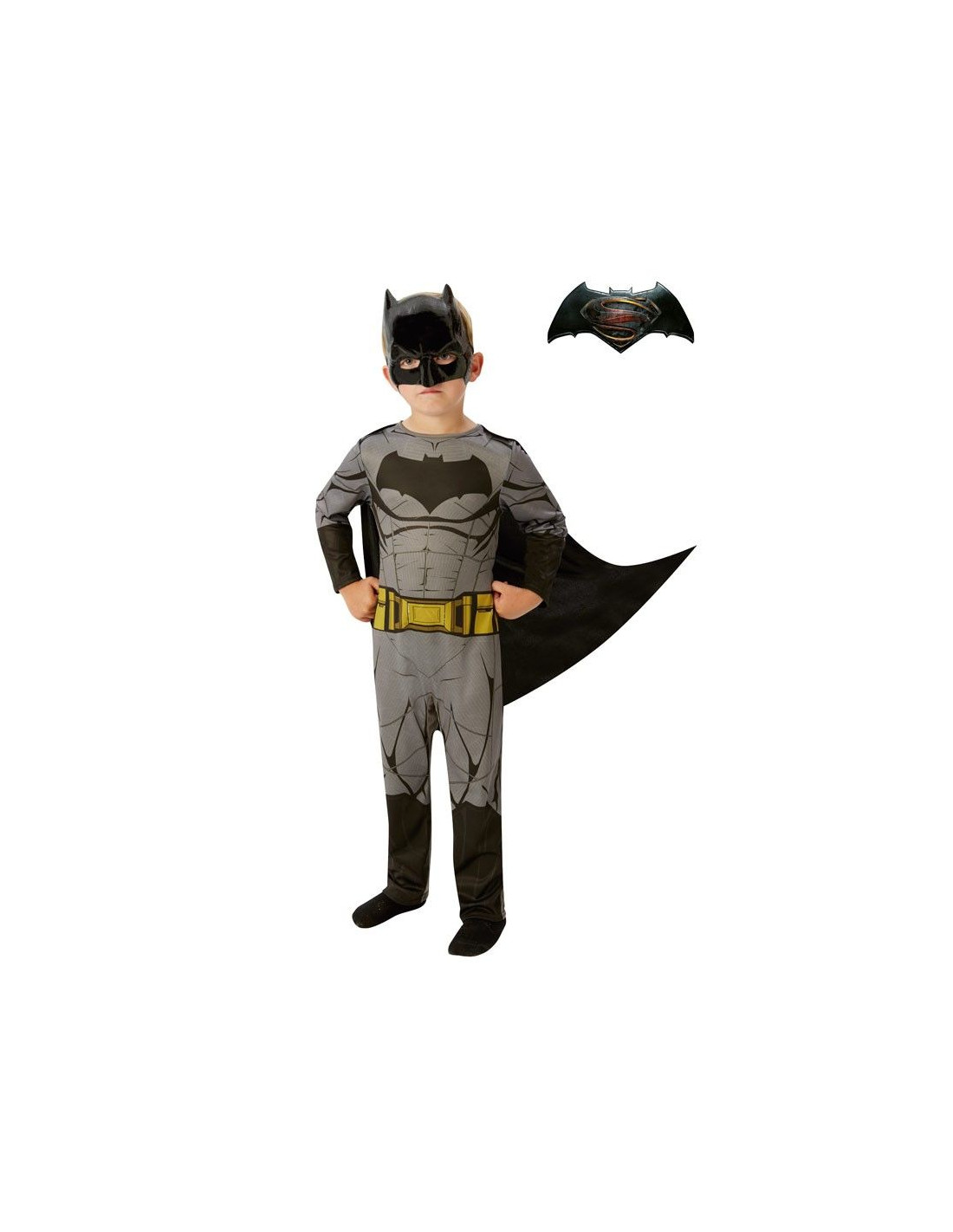 Disfraz de Batman para niño compuesto por un mono enterizo gris con detalles en negro que simulan las partes de la armadura, símbolo del murciélago en la parte frontal del pecho, capa negra y máscara. Producto con licencia oficial DC Comics.