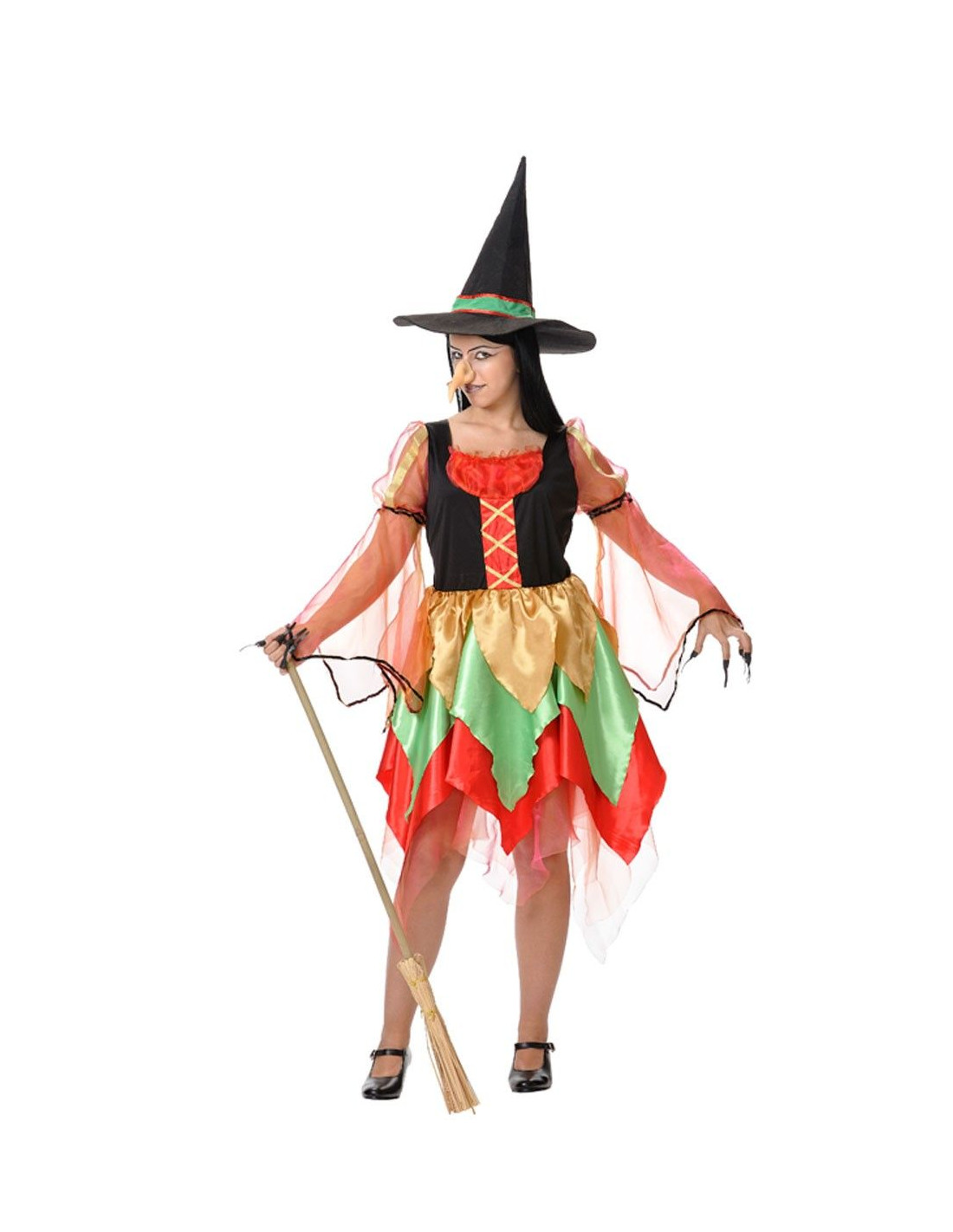 Vistoso disfraz de bruja de colores para que practiques los intrigantes ritos de la brujeria. Vestido y gorro