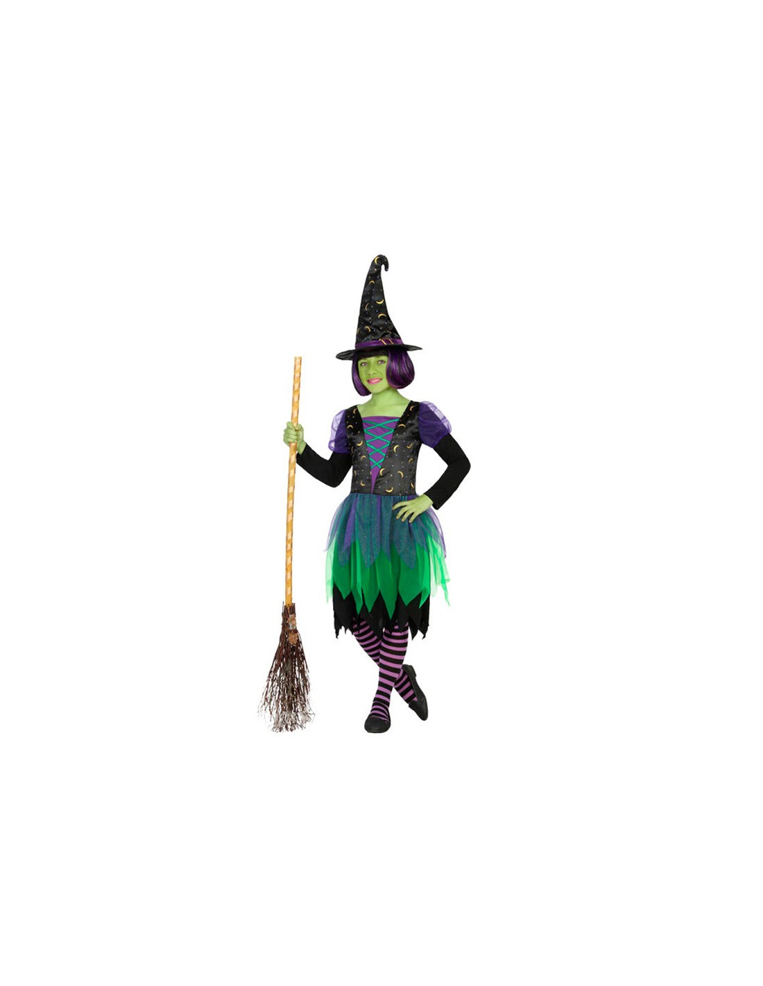 Disfraz de bruja verde infantil para Halloween. Tu pequeña se convertirá en una auténtica bruja piruja y atizará con su escoba al que se le ponga por delante. Completa tu disfraz caracterizándote con un maquillaje terrorífico para triunfar en la Noche de los Muertos, Fiestas Temáticas y Carnaval.