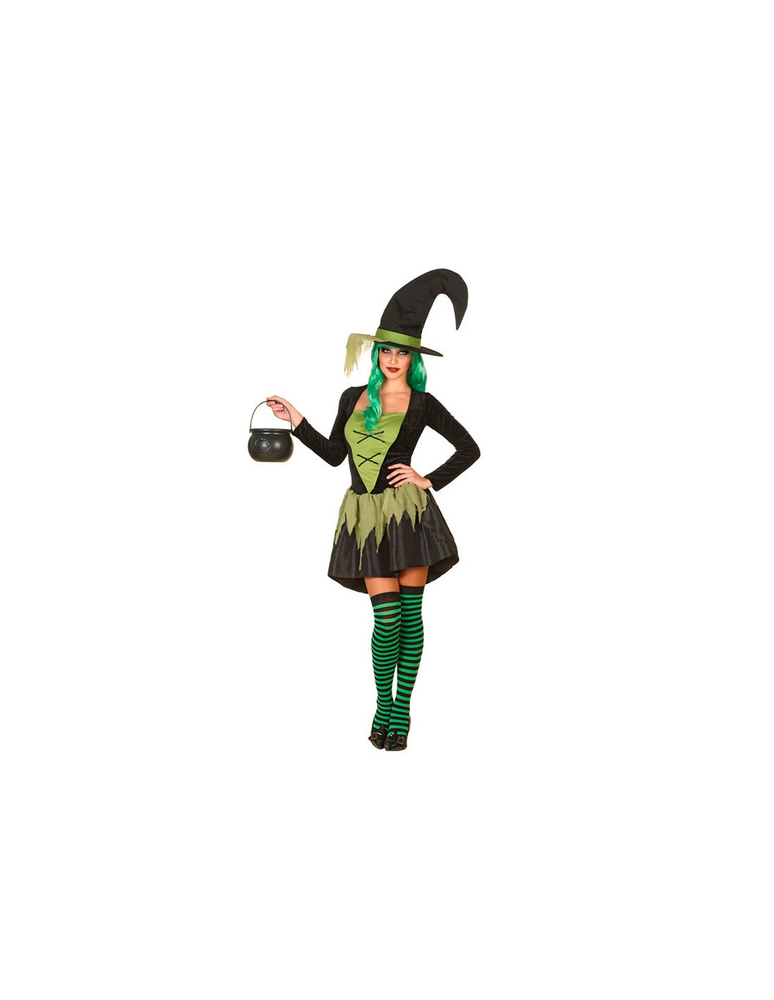 El disfraz de bruja verde para mujer contiene un vestido negro y verde con la falda más corta por delante y larga por detrás; y un sombrero a juego.