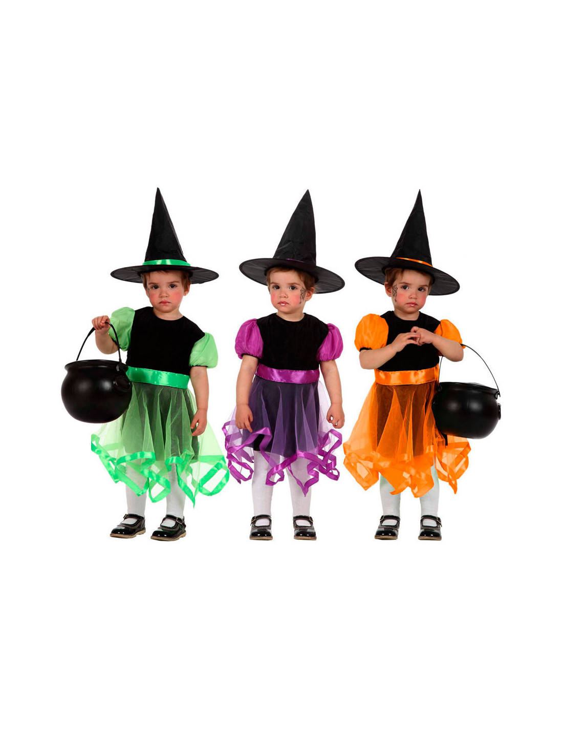 Este disfraz de brujita bebé contiene un vestido disponible en tres colores diferentes y un sombrero a juego.