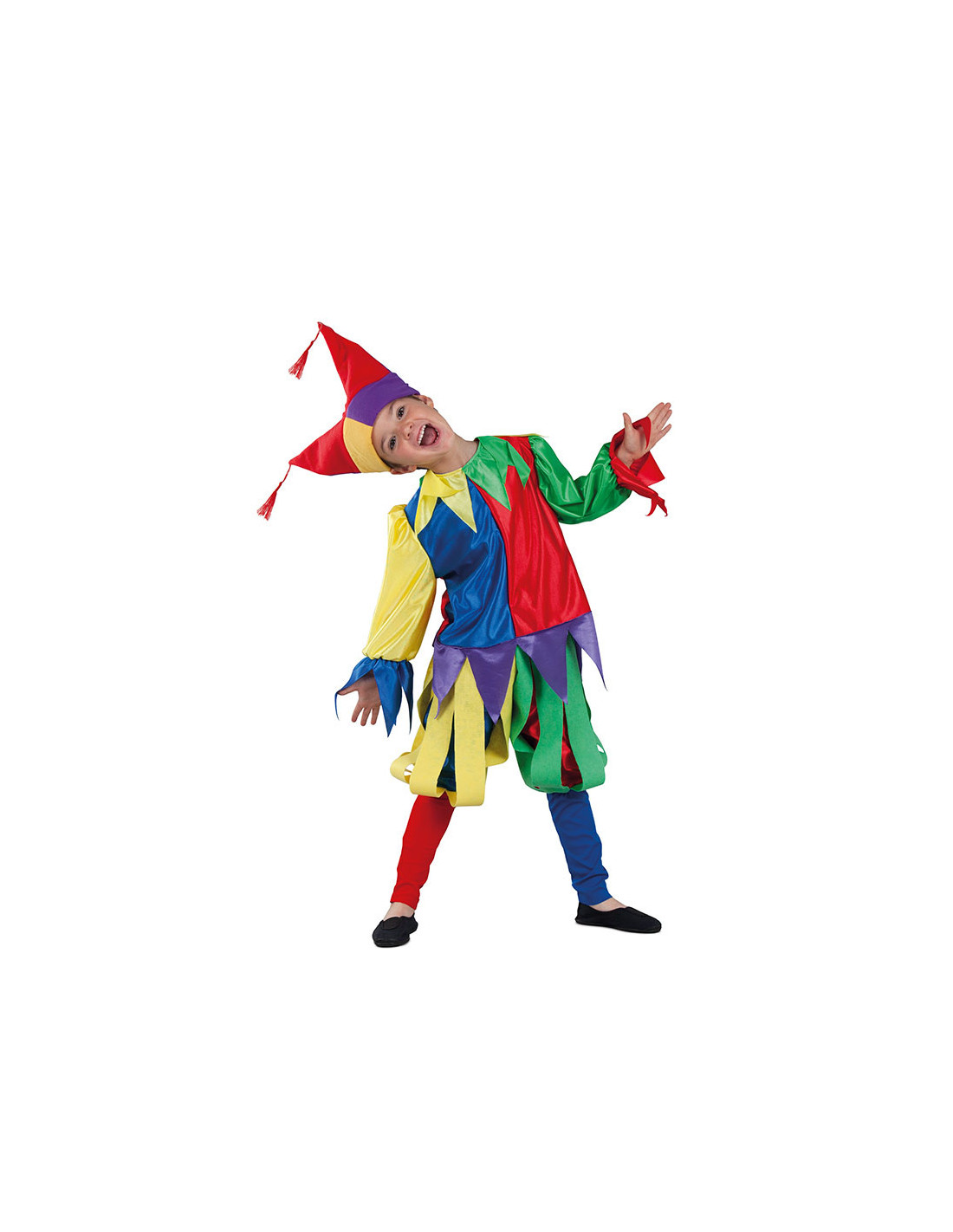 El disfraz de bufón medieval infantil contiene gorro, camiseta, pantalón y calcetines.