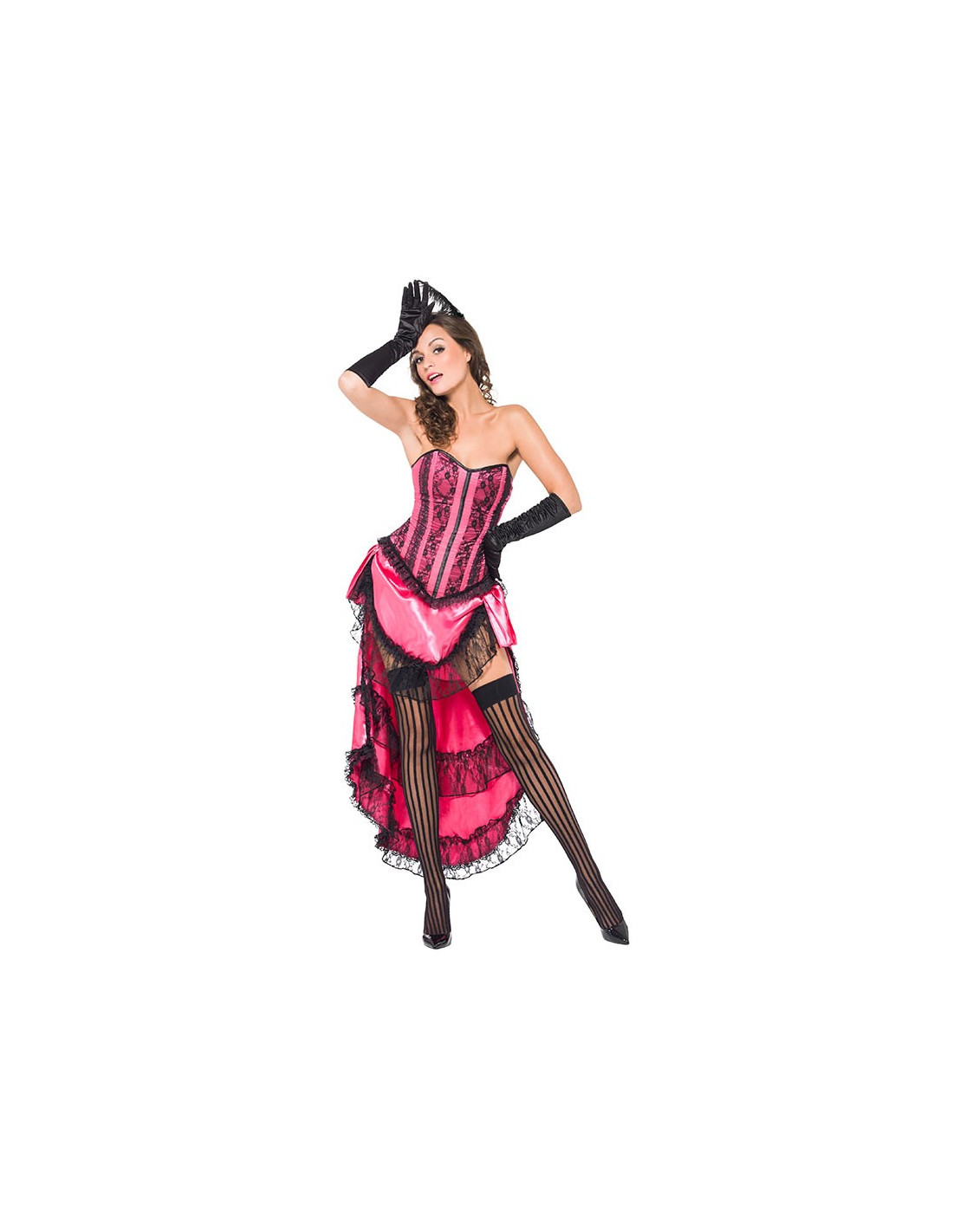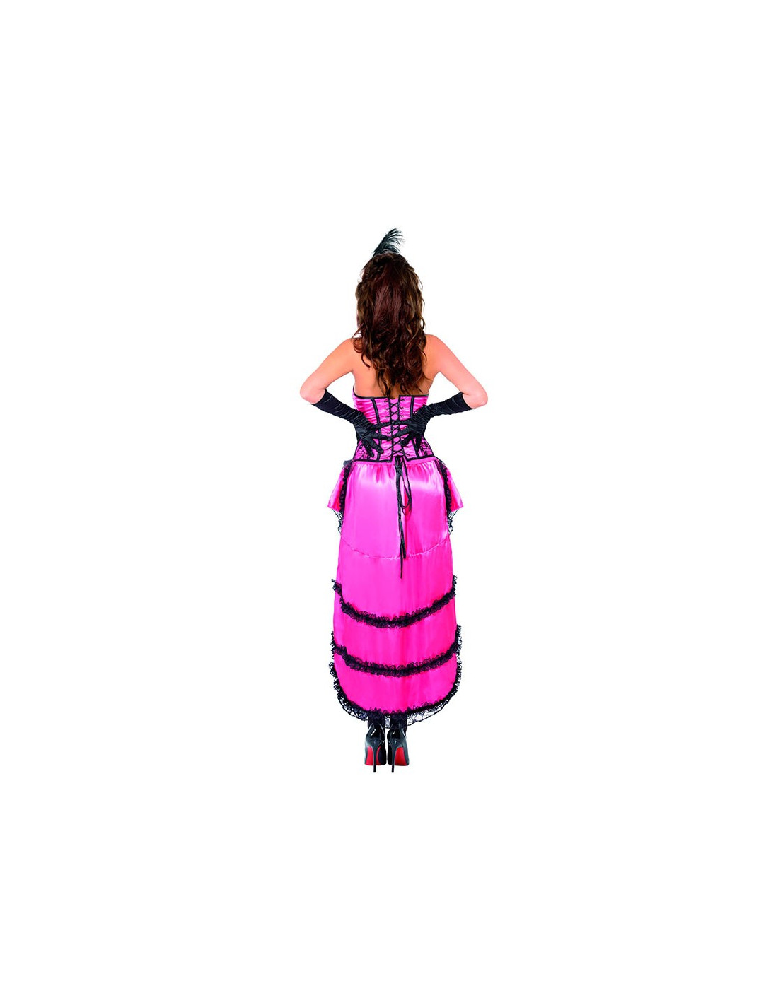 Disfraz de can can rosa para mujer que incluye corsé con cintas, falda con cola y tocado.