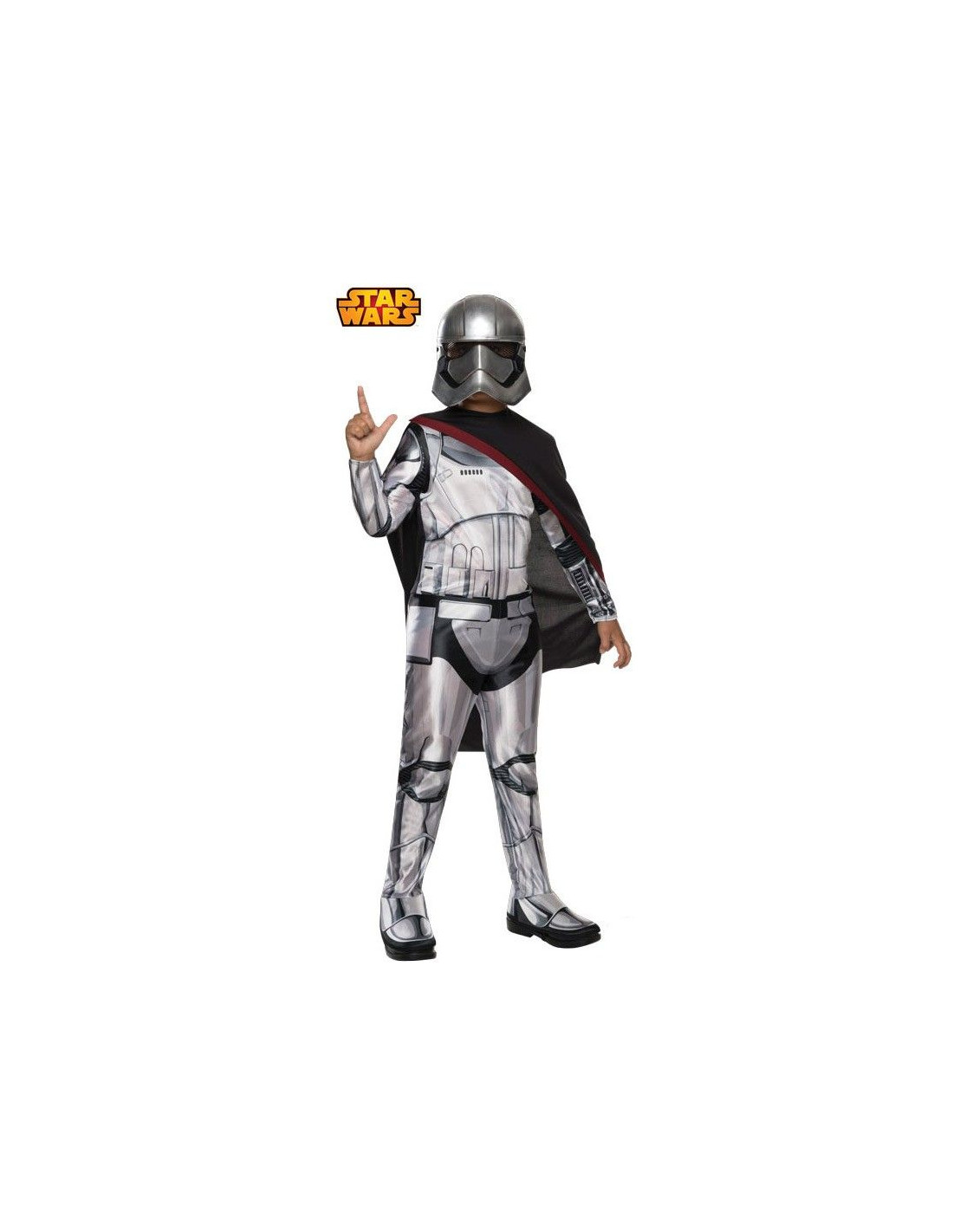 Disfraz de Capitán Phasma para niña compuesto por un mono gris con todos los detalles de la armadura estampados y cubrebotas incorporados, capa negra con los detalles en rojo y máscara plateada. Producto con licencia oficial Star Wars.