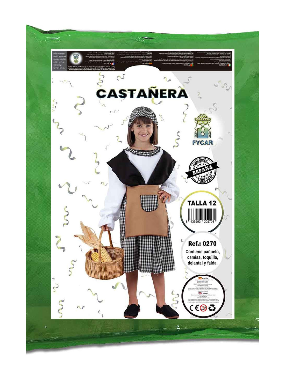 El traje de castañera contiene un pañuelo para la cabeza de cuadros blanco y negros, camiseta blanca de manga larga y cuello de cuadros, toquilla negra, delantal marrón con bolsillo y falda a cuadros blancos y negros.