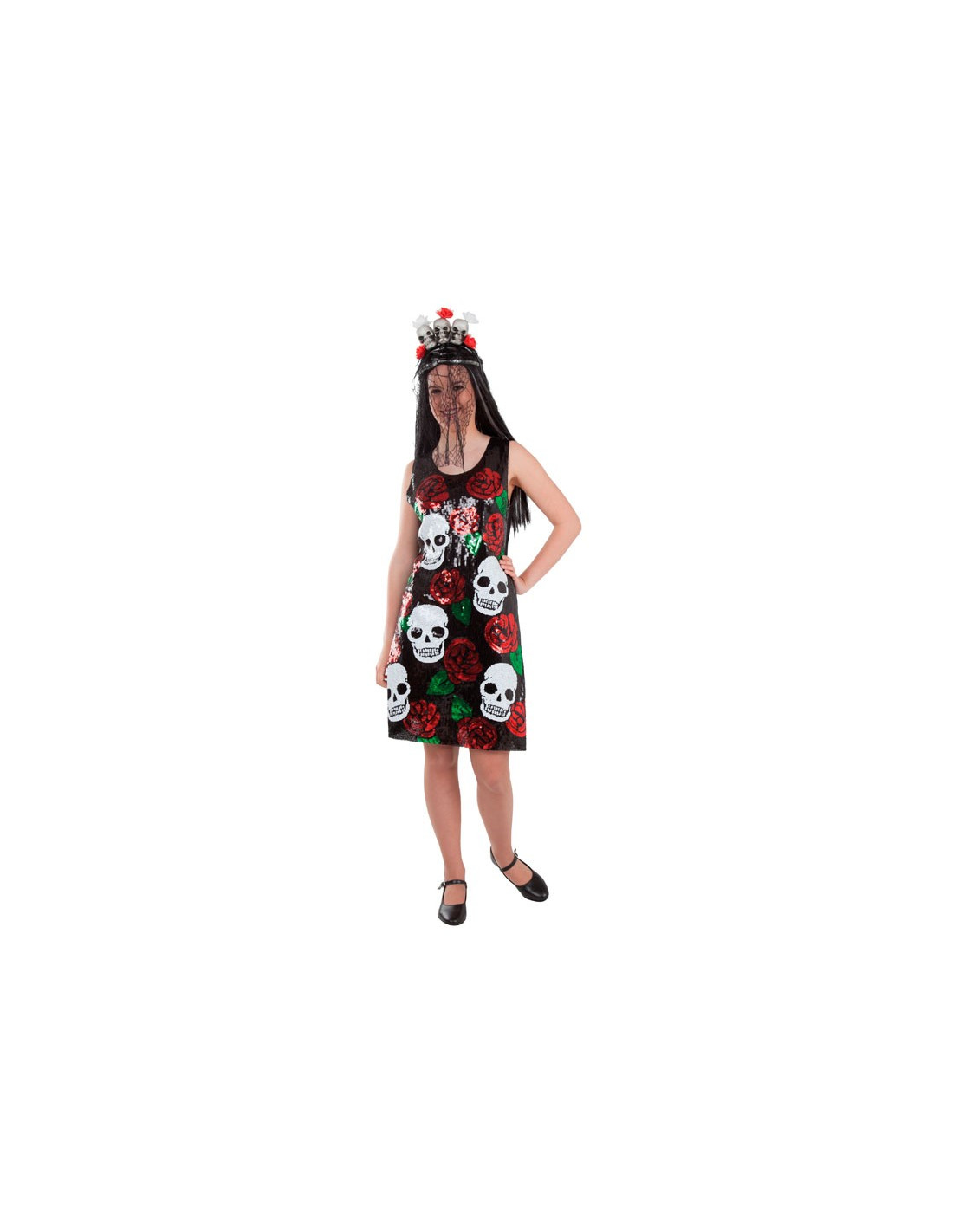 Disfraz de Catrina lentejuelas que incluye vestido de lentejuelas con rosas y calaveras.