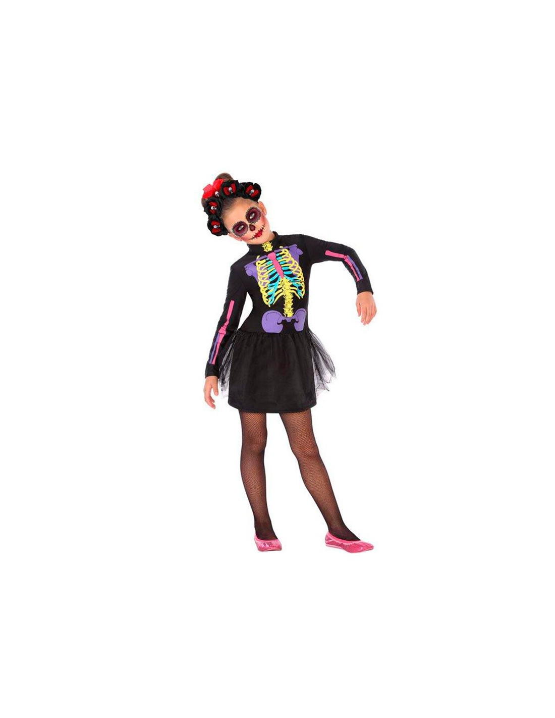 El disfraz de Catrina multicolor niña contiene un vestido negro de manga larga, con estampado de esqueleto multicolor y tul en la falda.