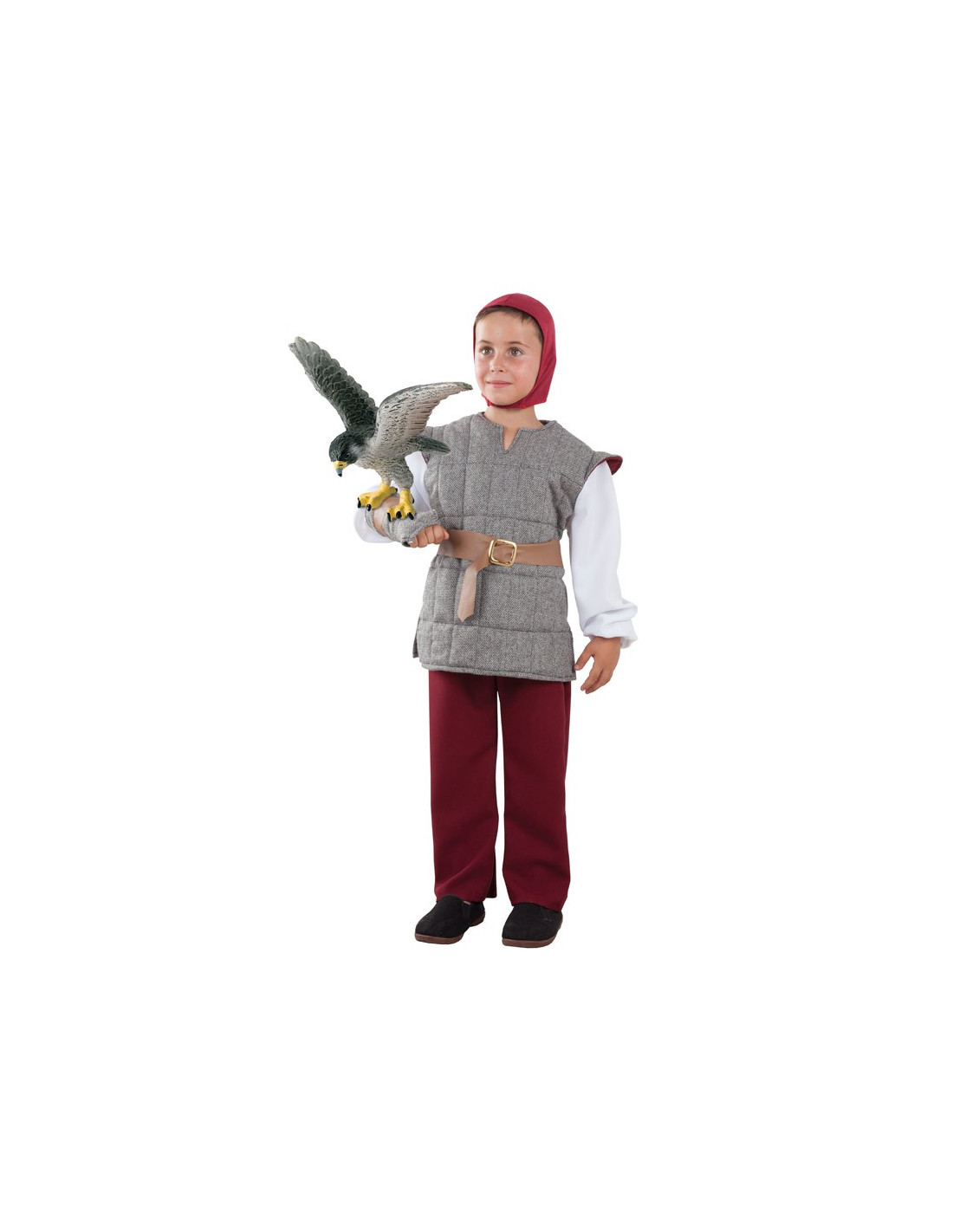 Traje de cetrero medieval para niño que incluye gorro, chaleco con mangas, guante, cinturón y pantalón. No incluye halcón.
