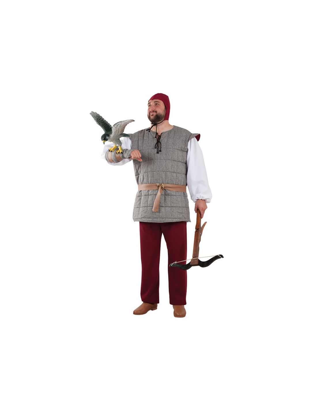 Caza como lo hacían nuestros antepasados y conviértete en pieza clave para tu rey gracias a este fantástico disfraz de cetrero para hombre. Compuesto por un gorro en color vino, un chaleco gris acolchado con mangas simulando tener puesta una camisa en su interior, guante para apoyar al halcón, cinturón y pantalón a juego con el gorro, este traje de halconero es ideal para sentirte un miembro más en la sociedad de la Edad Media.