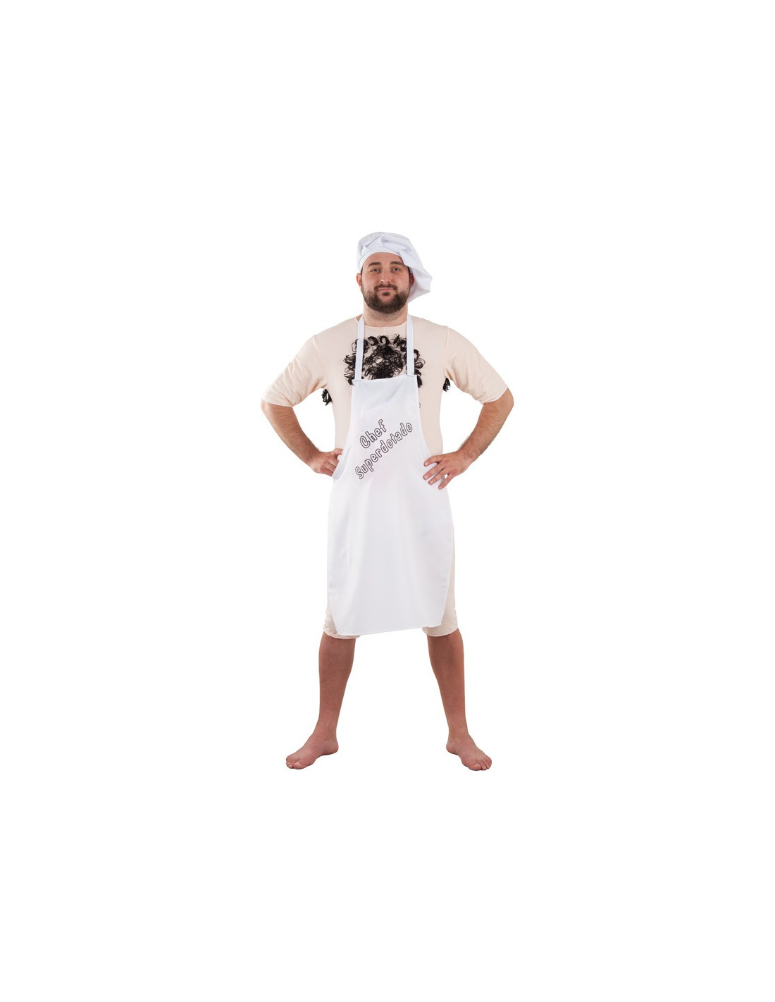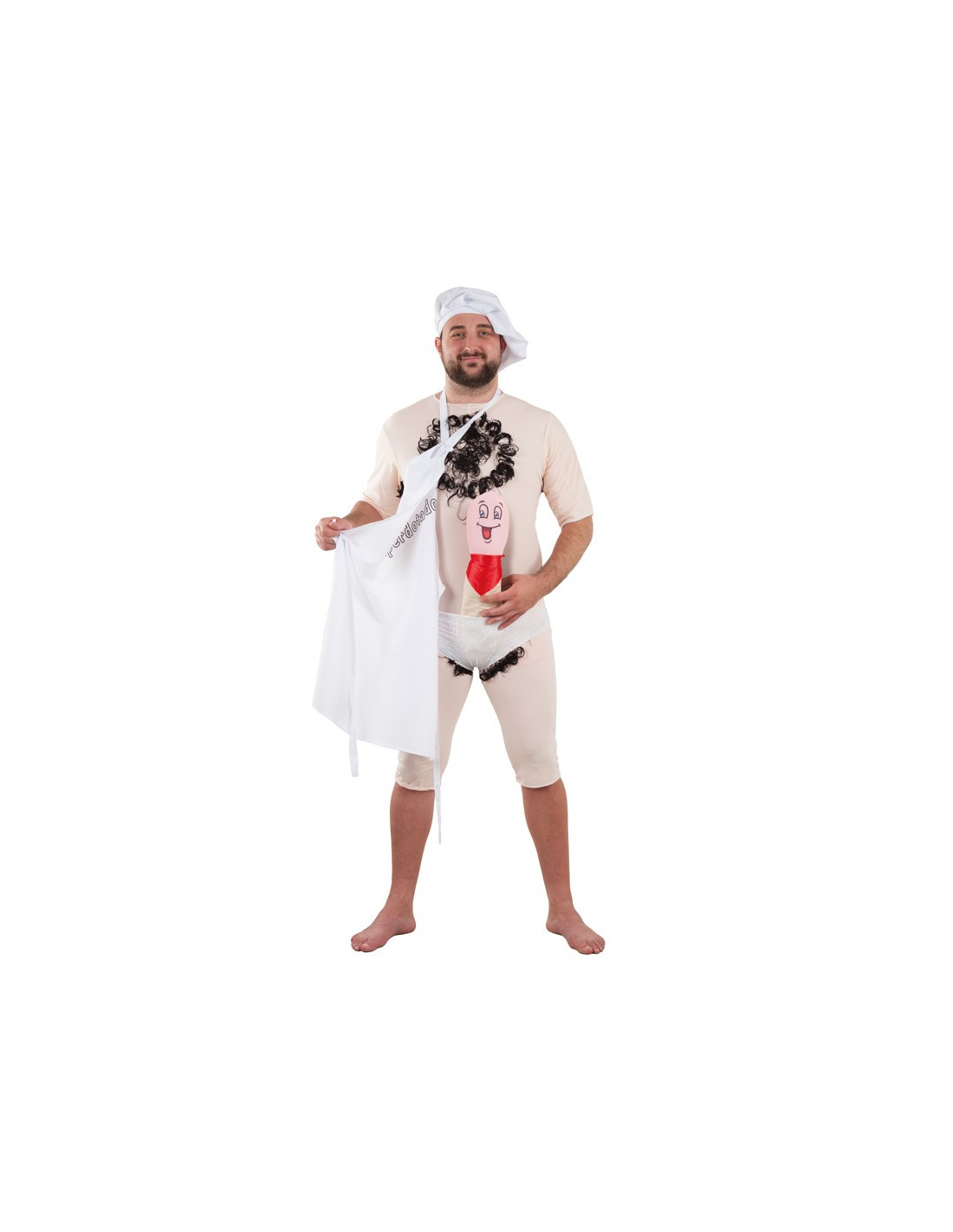 Disfraz de Chef superdotado que incluye mono con pelo, delantal y calzoncillo con pene. No incluye sombrero