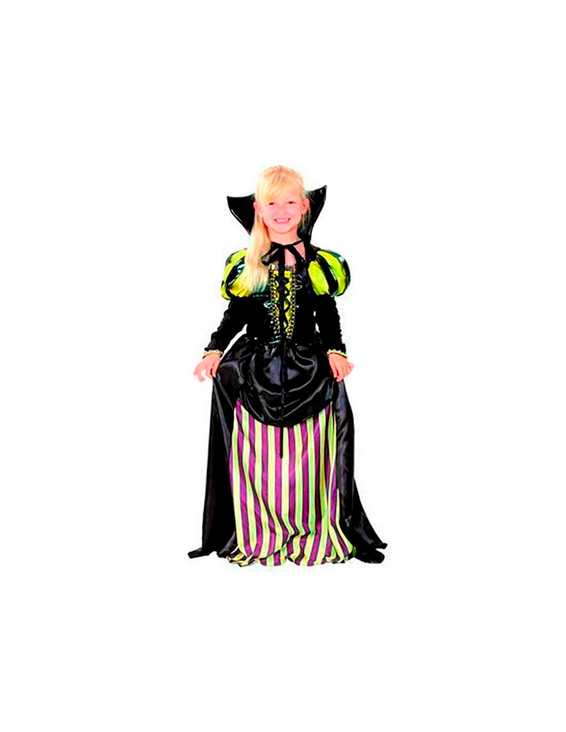El disfraz de condesa para niña contiene un elegante vestido negro con detalles amarillos en mangas y pecho. La falda es amarilla con rayas moradas. Además incluye una capa de cuello alto para atar con lazada.