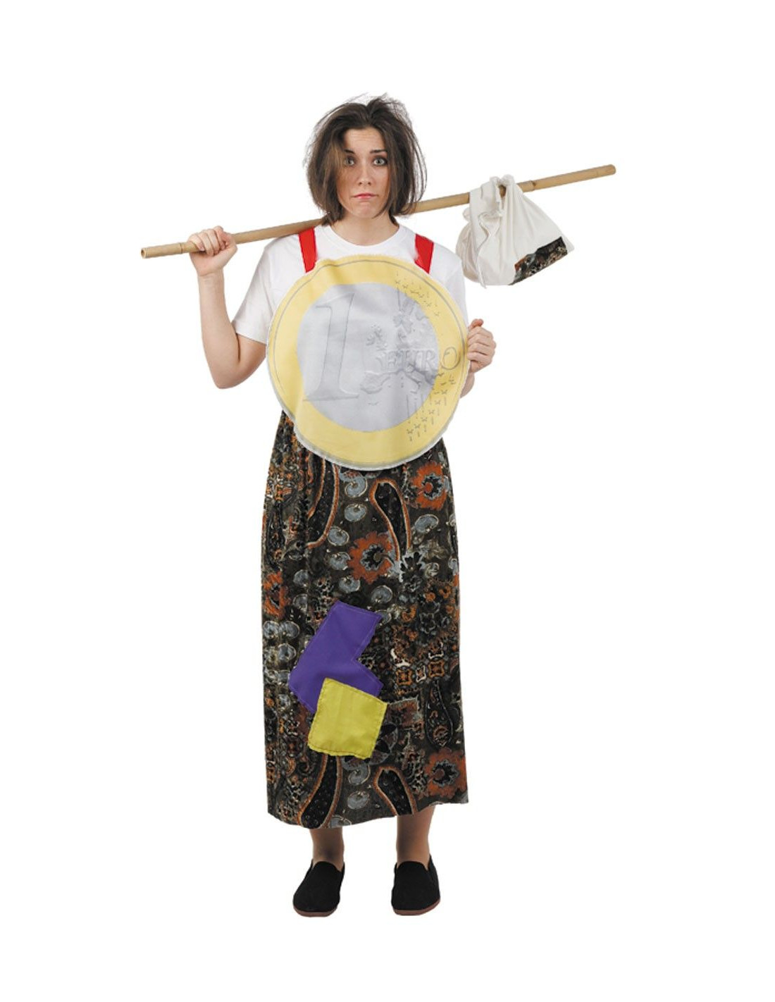Disfraz de crisis mujer que incluye camiseta blanca, moneda de Euro por delante y por detrás estampadas, falda de terciopelo estampado y saco