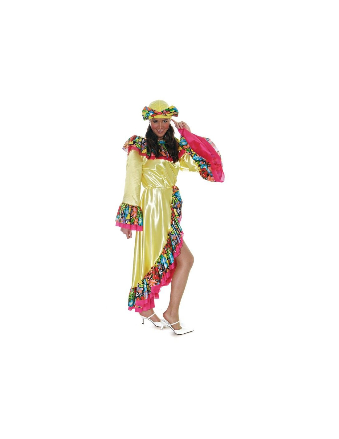 Disfraz de Cubana, que incluye: Vestido amarillo con volantes en las terminaciones de las mangas y la falda de estampado multicolor y tocado para la cabeza amarillo. Equivale a una talla 44. Talla unica.