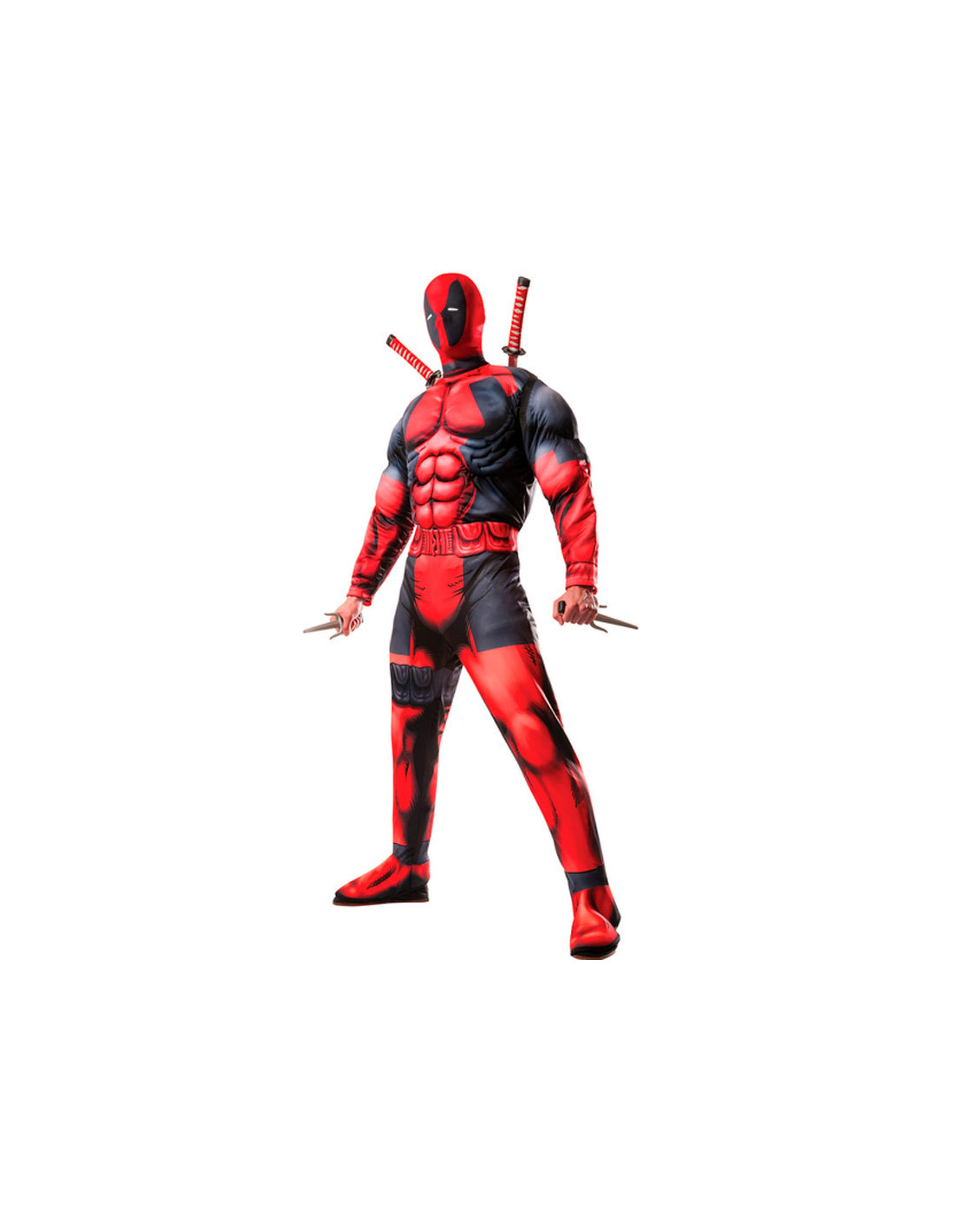 Incluye un original disfraz de Deadpool para hombre, compuesto por un mono rojo acolchado en la parte del torso simulando la musculatura del anti-héroe, cinturón y capucha enteriza. Producto con Licencia Oficial Marvel.