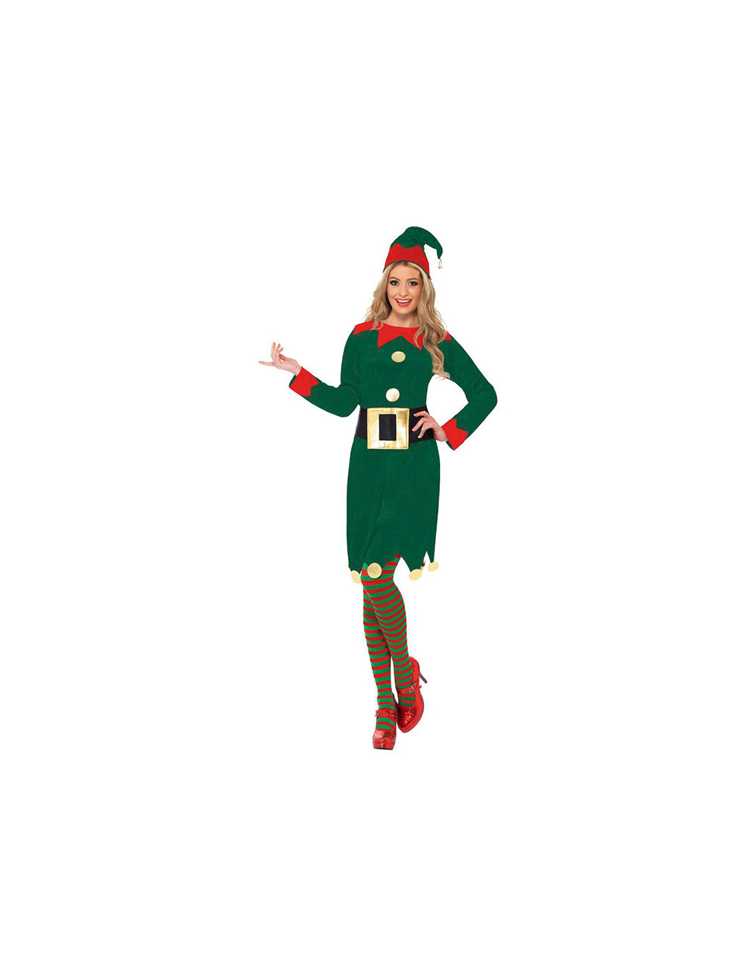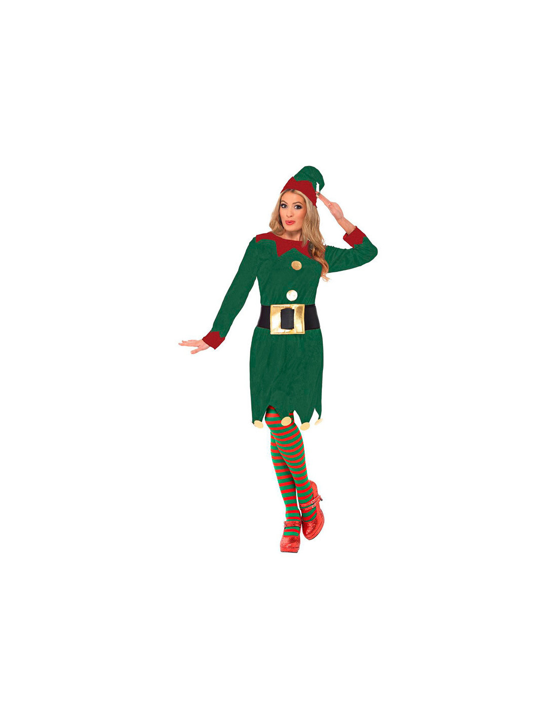 Este completo disfraz de elfa de la Navidad contiene un vestido verde con detalles en cuello y mangas de color rojo, y uno botones ficticios dorados; contiene además un cinturón y un gorrito a juego.