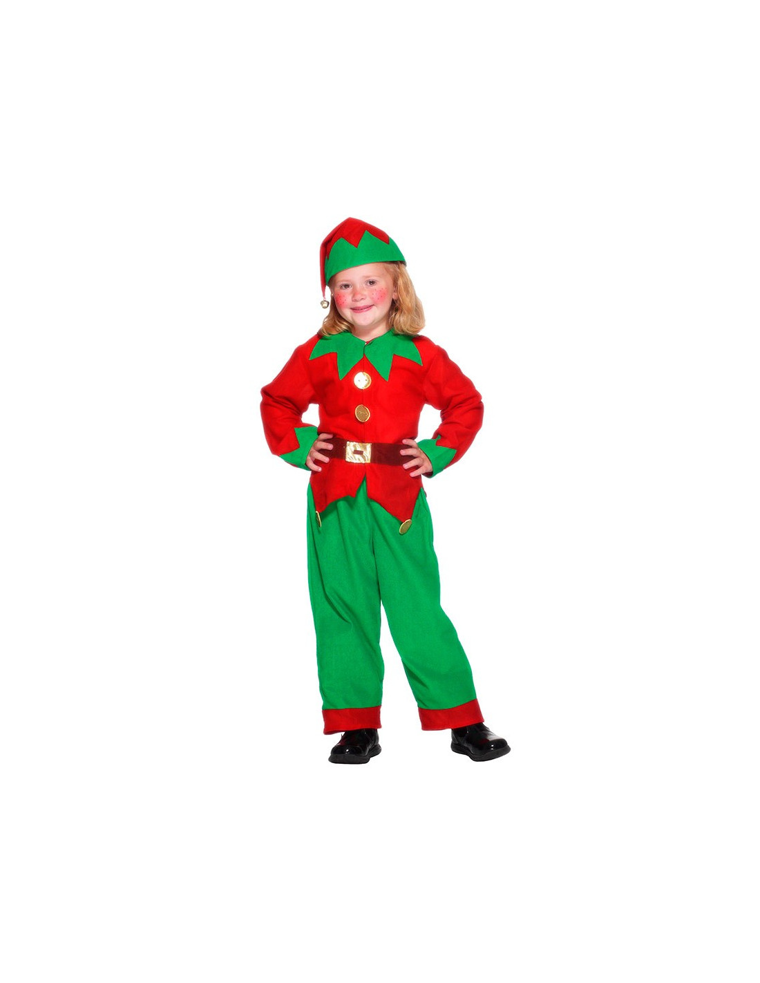 El disfraz de Elfo infantil unisex contiene una camiseta adornada con cuello, botones y cinturón cosido, un pantalón verde y un gorro a juego.