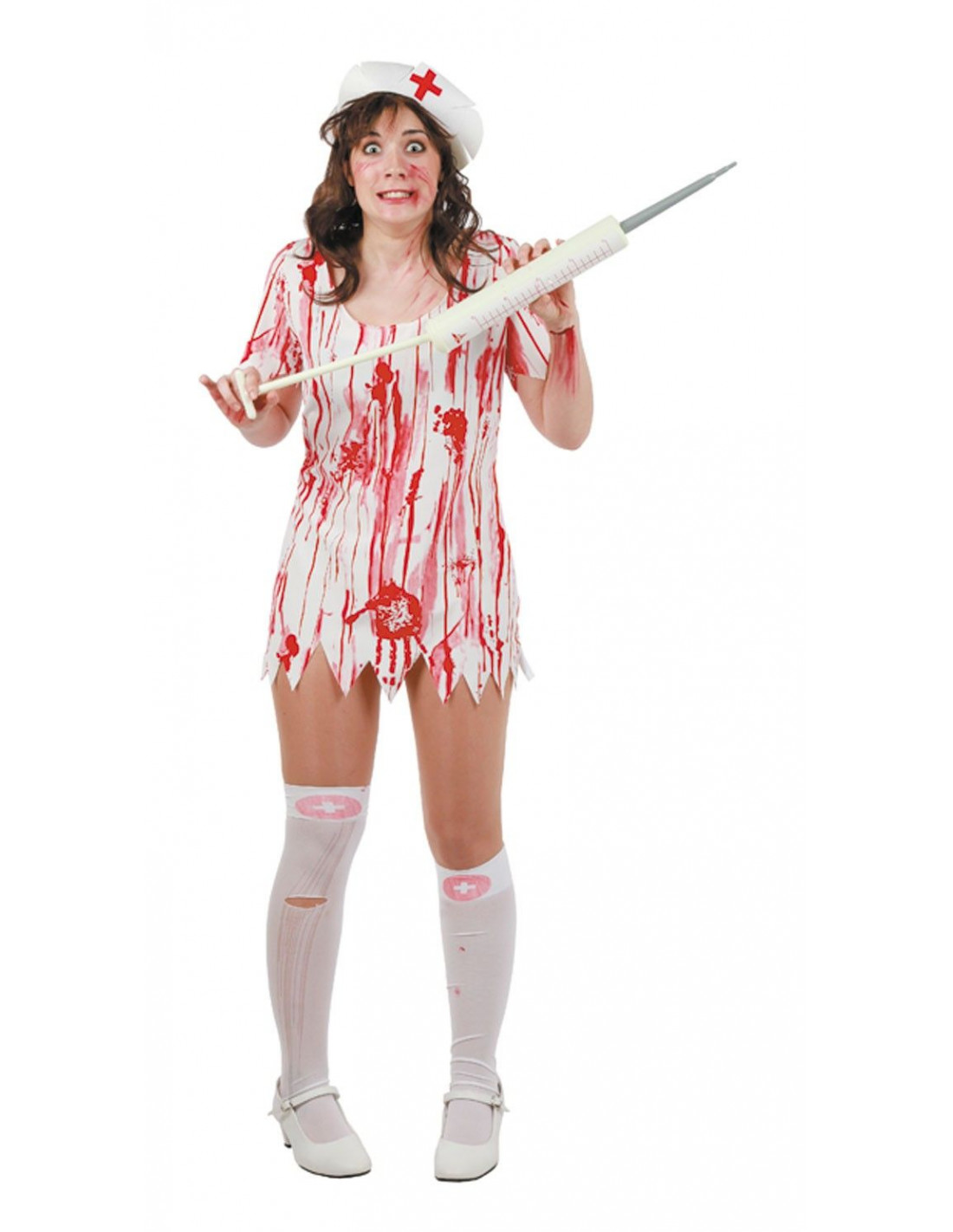 Disfraz Enfermera asesina, que incluye: Cofia de foam blanco con cruz roja, vestido blanco estampado con manchas de sangre y medias.