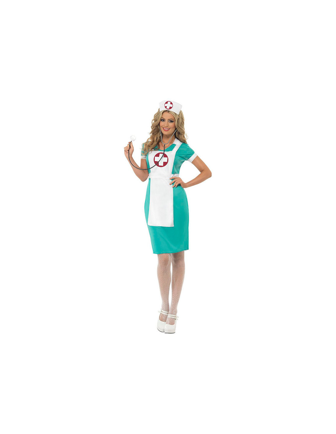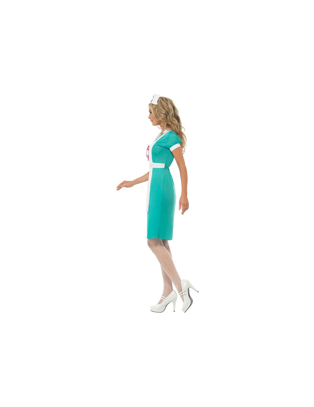 Disfraz enfermera clásica para mujer que incluye vestido con delantal cosido y cofia.