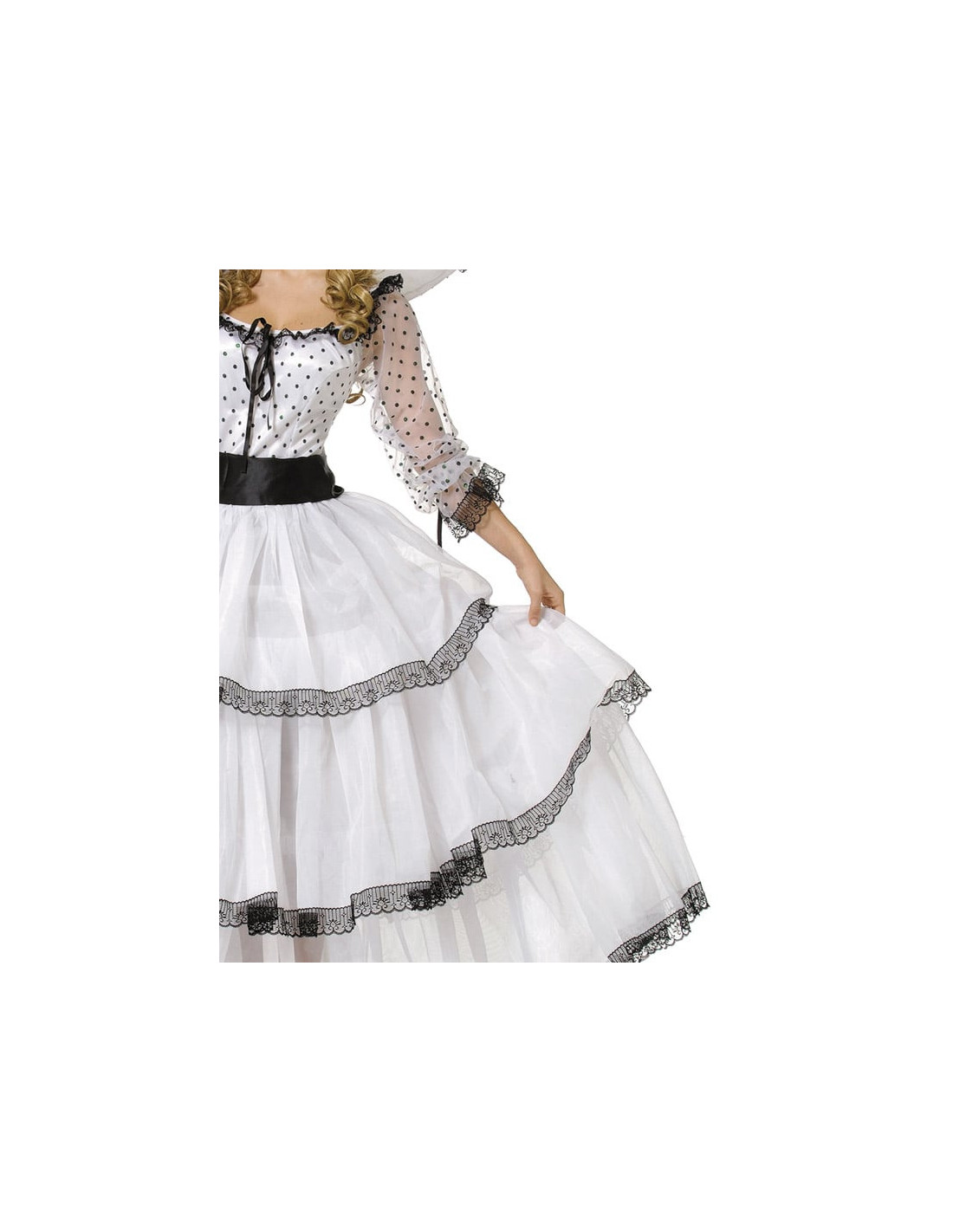 Lujoso y fantasioso). Incluye vestido blanco con lentejuela iris, fajín negro y pamela blanca (da bastante talla) . La falda lleva tres volantes rematados con puntilla negra para dar un gran volumen al conjunto, el corpiño blanco con topos de lentejuela iris y las mangas de gasa.