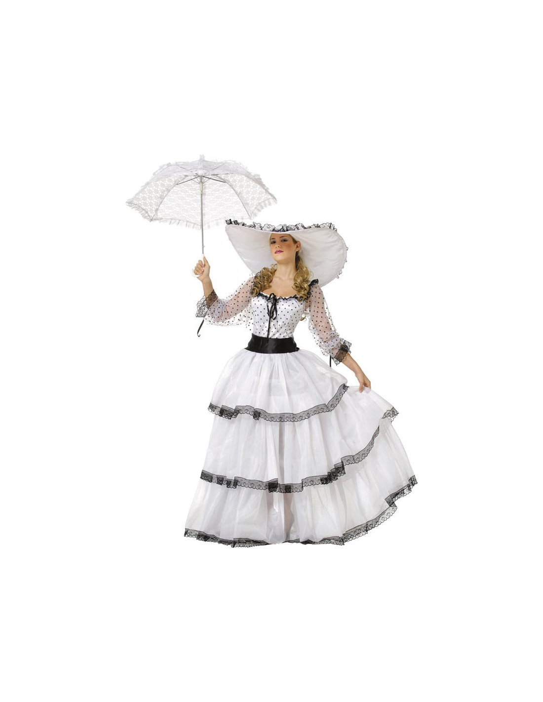 Disfraz de Escarlata, que incluye: Vestido blanco con lentejuela iris, fajín negro y pamela blanca (da bastante talla) . La falda lleva tres volantes rematados con puntilla negra para dar un gran volumen al conjunto, el corpiño blanco con topos de lentejuela iris y las mangas de gasa.