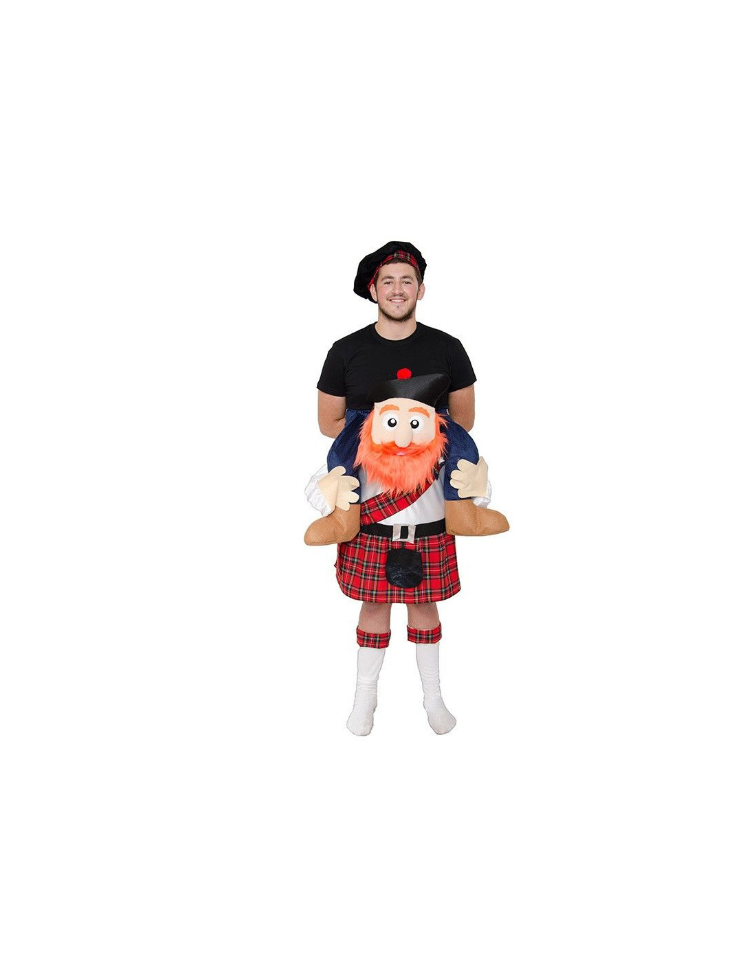 Disfraz de escocés a hombros para hombre que incluye pantalón con escocés simulando que te lleva a hombros; gorro y calcetines.