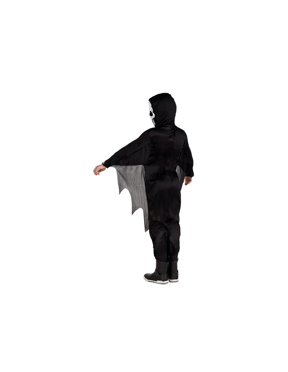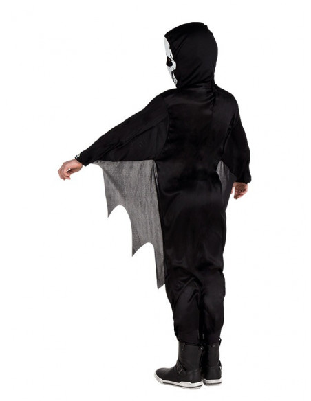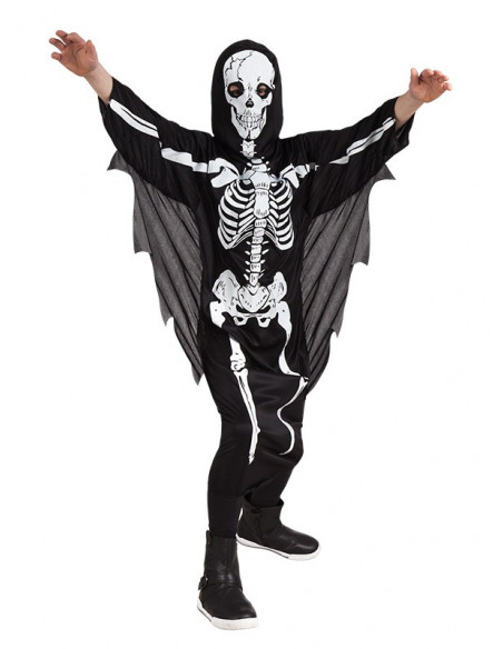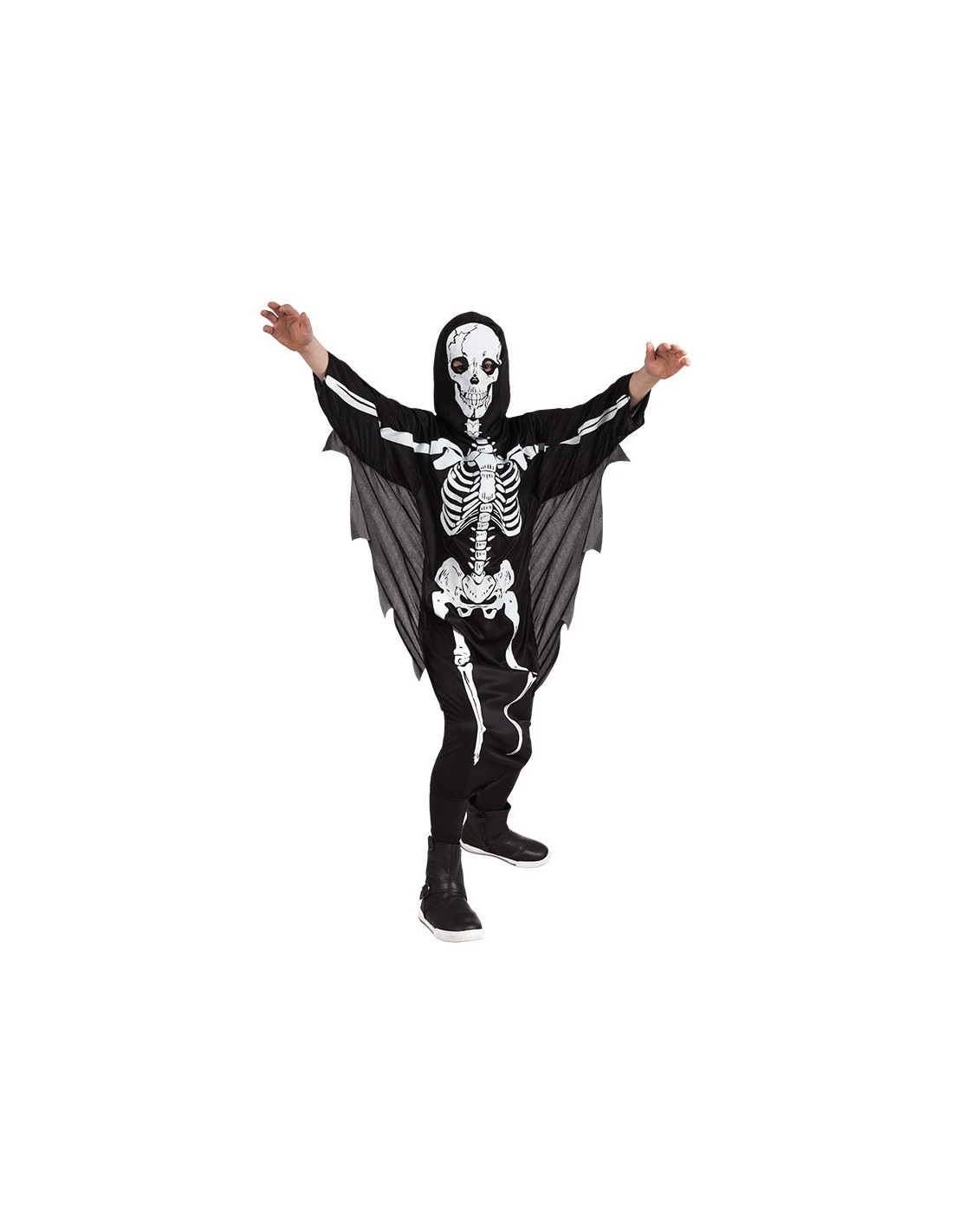 El disfraz de esqueleto infantil contiene un mono estampado con una tela a modo de alas de los brazos a las piernas, y una capucha con máscara estampada.