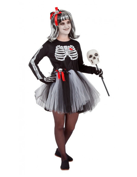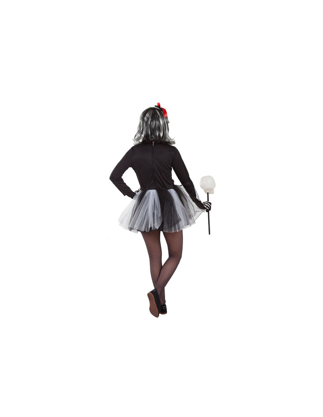 Este disfraz de esqueleto tutú para mujer contiene un vestido de manga larga con mangas y pecho estampado y la falda es de tul blanco y negro. En la cintura tiene un detalle de un doble lazo y una calavera. Además incluye una diadema con ese mismo detalle. Completo tu look con un peluca blanca y un maquilla de esqueleto con el que impactar a tus amigos.