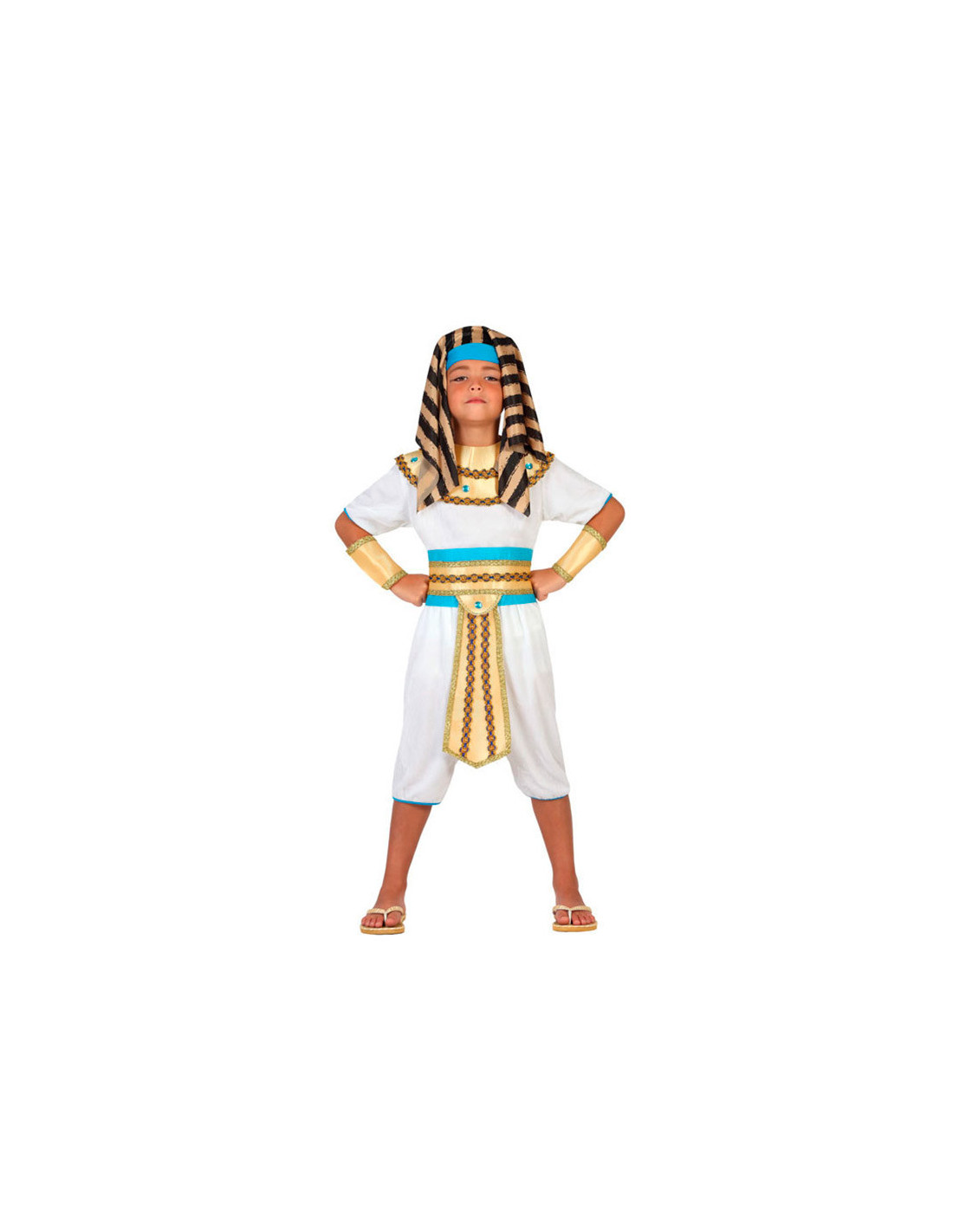 Disfraz de Faraón Egipcio niño que incluye pantalón, camiseta con cuello, tocado, muñequeras y cinturón.