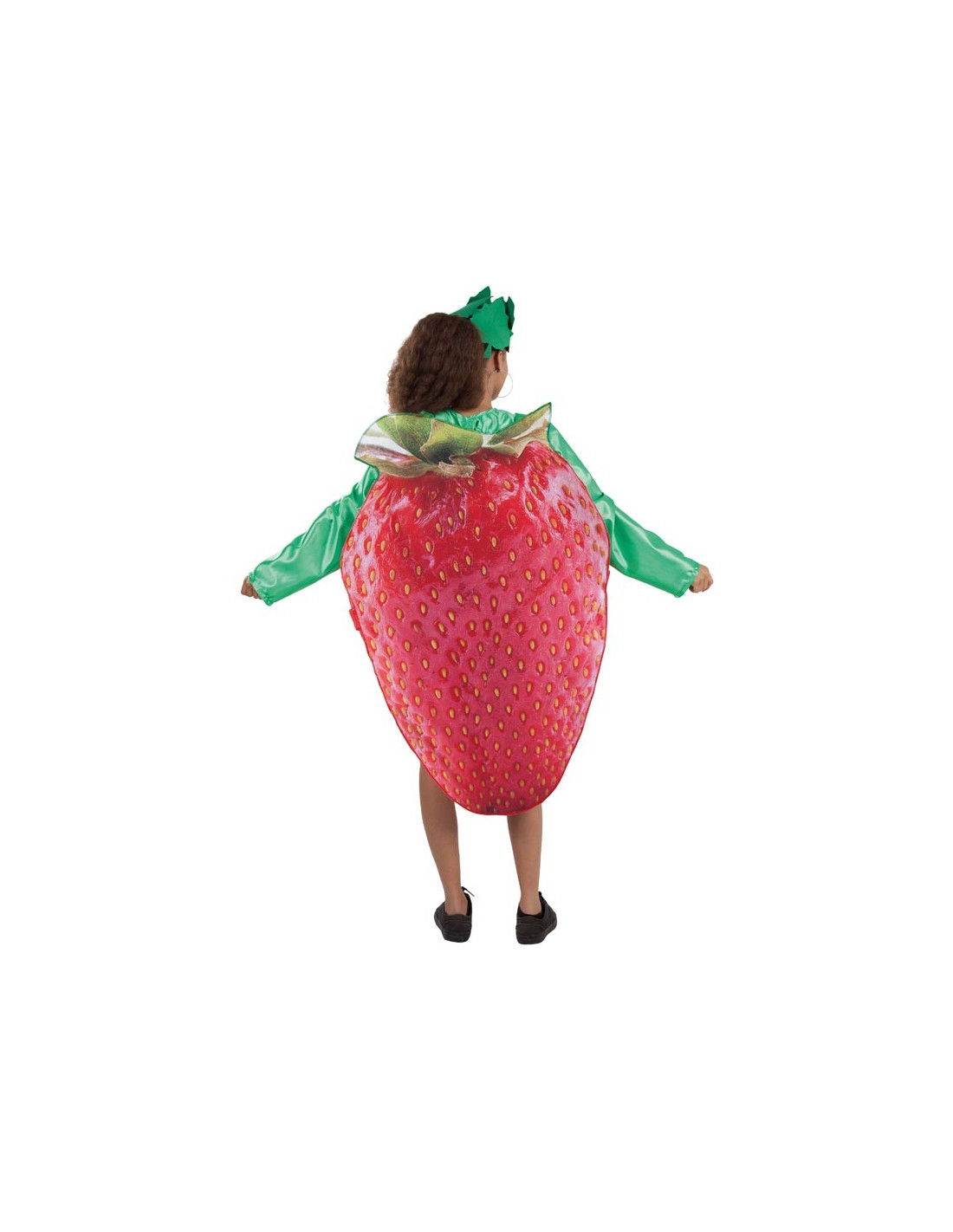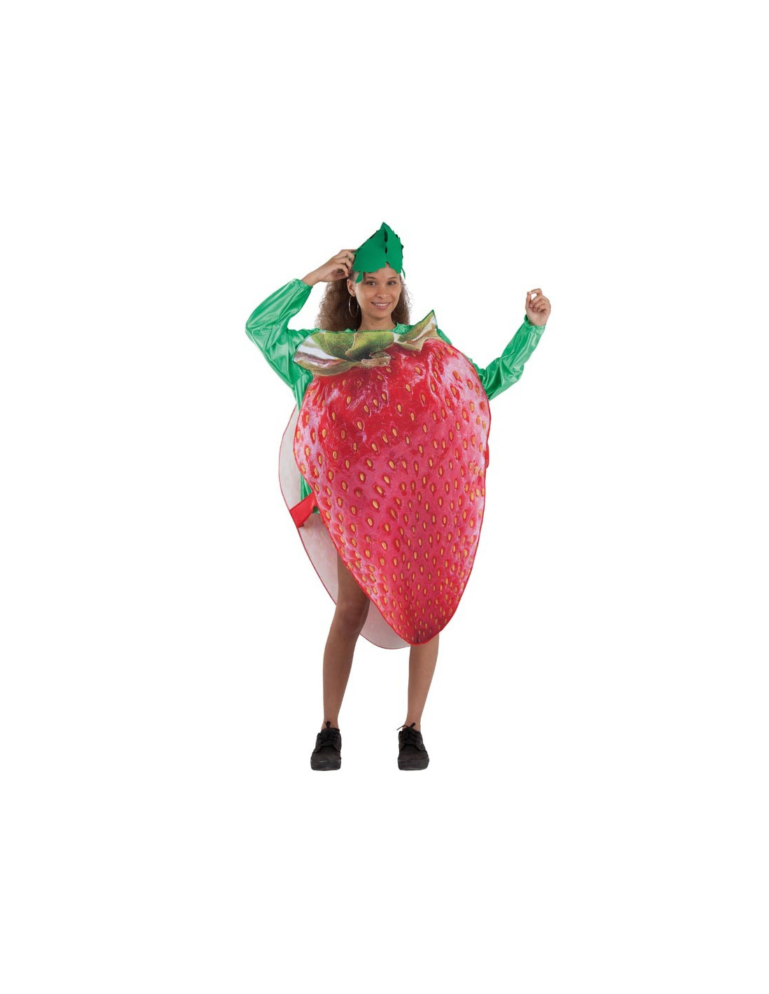 Transfórmate en una dulce fruta con este original disfraz de fresa para adulto. Compuesto por una camisa y gorro verde que simula la rama del árbol, y una realista fresa estampada mediante sublimación sobre una tela foamizada, este traje es ideal para disfrazarse en grupo. Incluye también unas tiras para sujetar por la parte de los hombros.