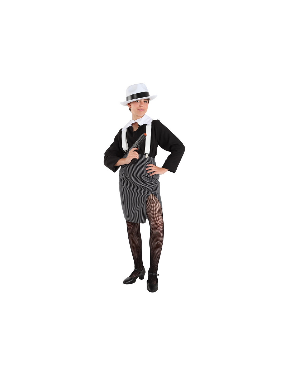 Atemoriza al personal con tu disfraz de ganster para niña. Perfecto para fiestas temáticas y disfraces en grupo. Incluye camisa, falda, tirantes y pajarita.
