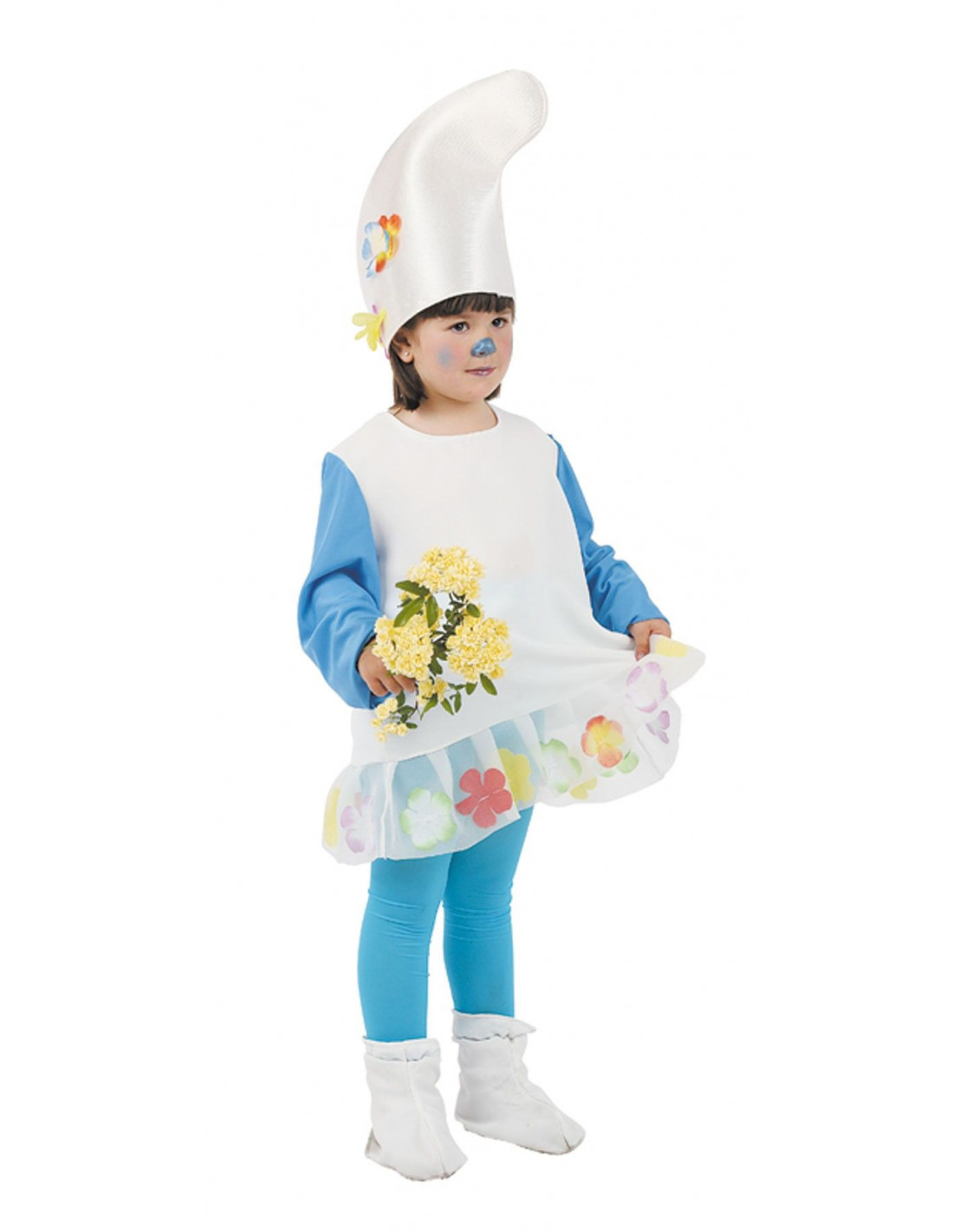 Disfraz de Gnomo azul para niña con la que se convertirá en la auténtica enanita del bosque. Incluye vestido blanco de mangas azules con volante en el bajo con estampado de flores, cubre botas blanco y un gorro blanco. No incluye flores.
