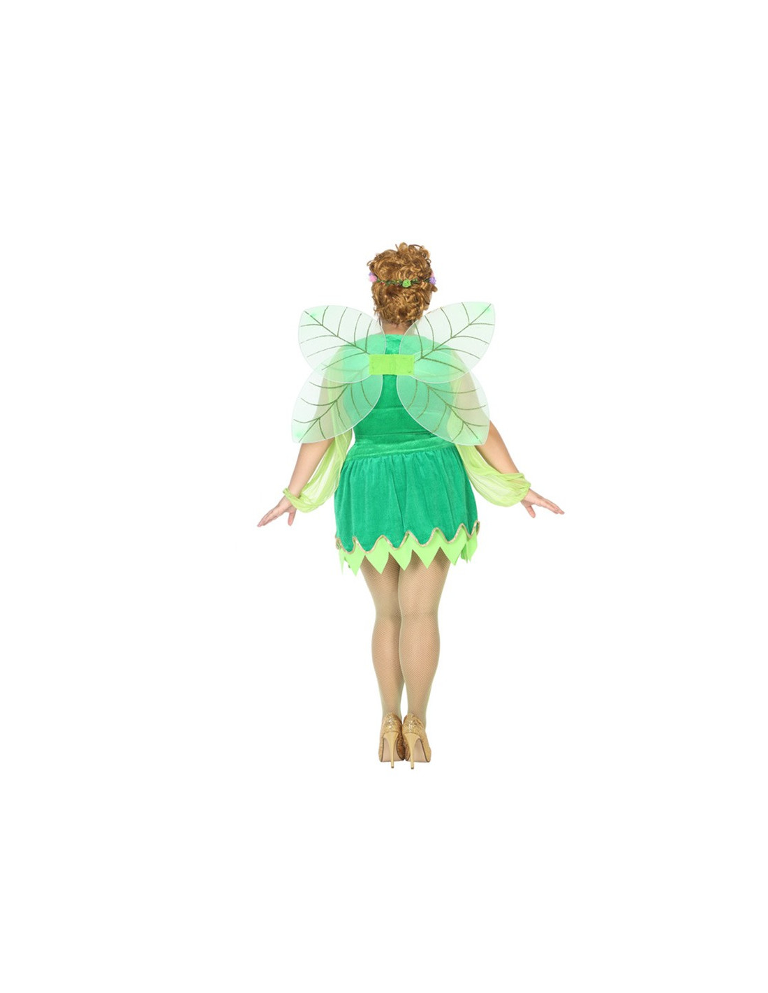Este disfraz contiene un vestido verde con detalles dorados y acabado en picos. El vestido es de tirantes pero tiene unas mangas abiertas verdes que se sujetan en las muñecas con una goma elástica. Además incluye unas hermosas alas.