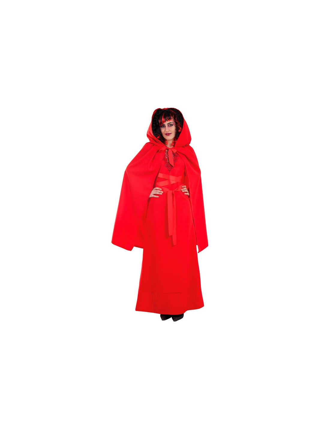 Este versátil disfraz de hechicera para mujer contiene una capa con capucha que se ata al cuello mediante lazada y un largo vestido de tirantes rojo.