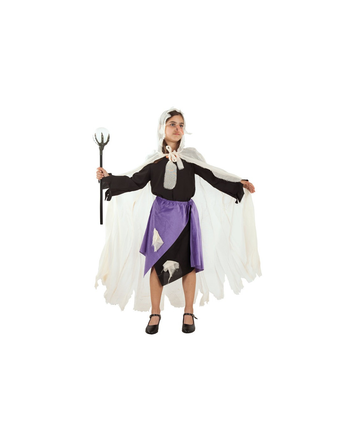 Disfraz de hechicera para niña que incluye capa, camiseta y falda. No incluye cetro ni nariz.