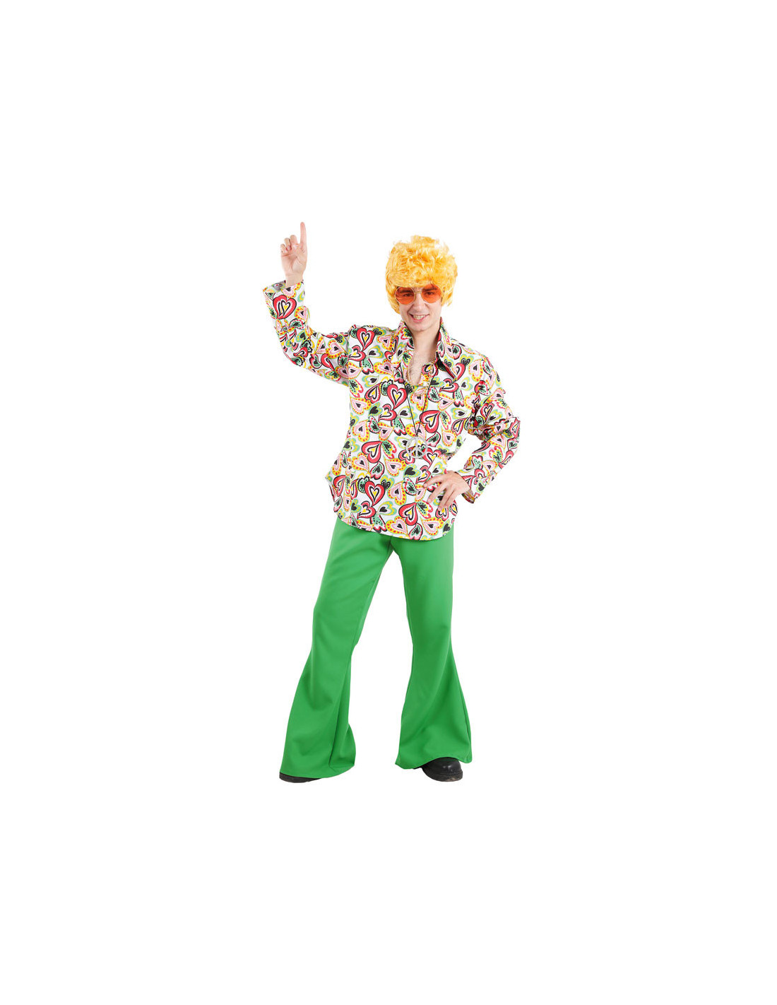 Revive los mejores momentos de Studio 54 con este disfraz Años 70 para hombre. Incluye camisa estampada con corazones con cuello grande ( al puro estilo disco) y pantalón verde acampanado (ambas piezas están fabricadas de strech).