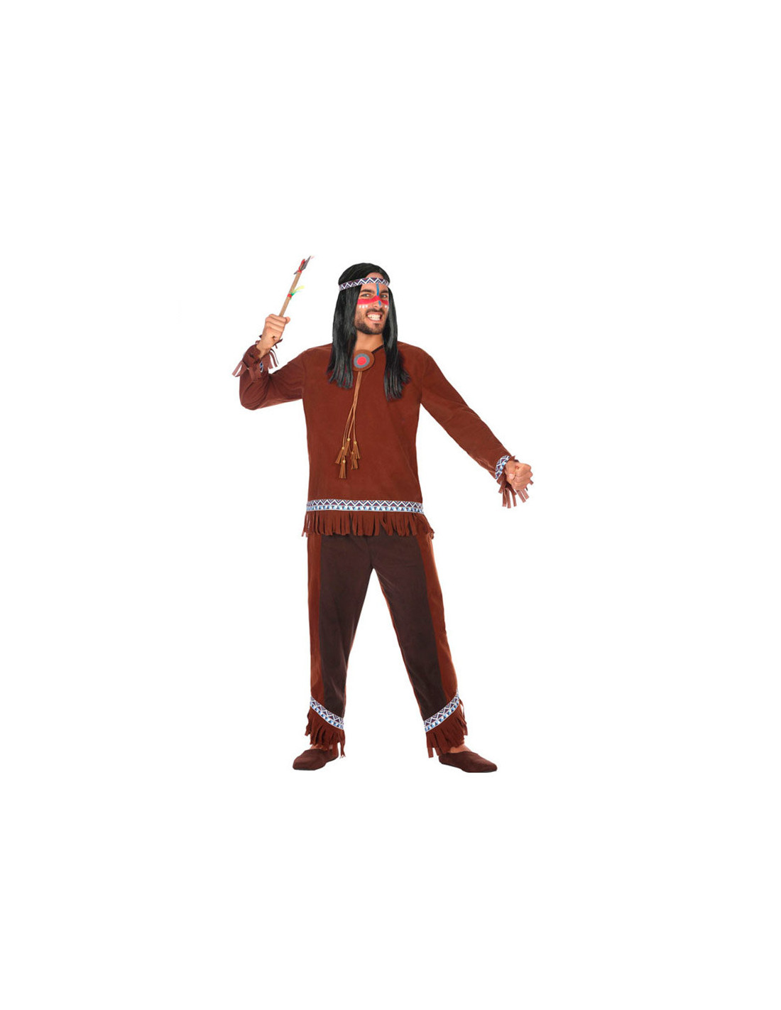 Disfraz de indio marrón para hombre que incluye camiseta, cinta para la cabeza y pantalón.