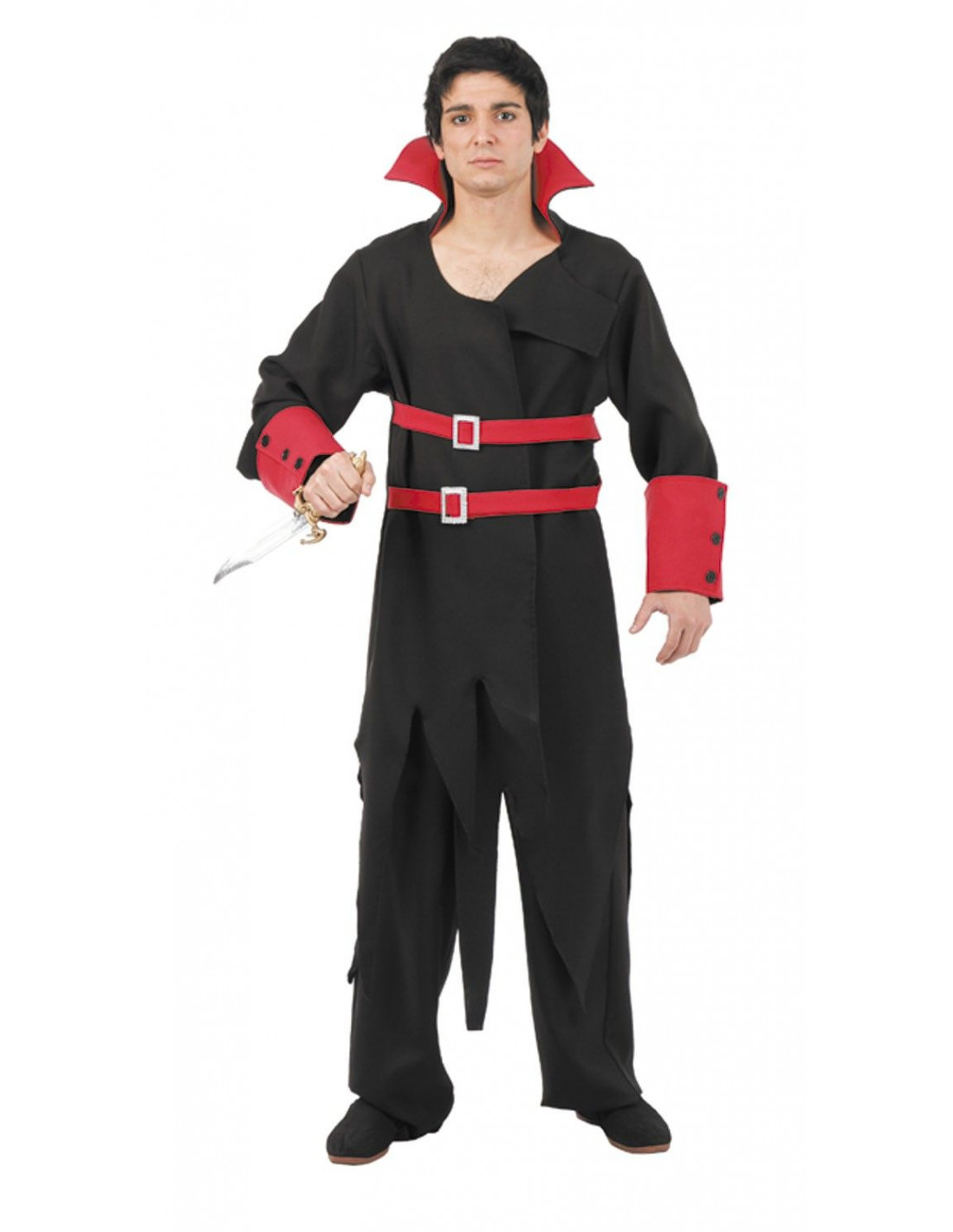 Disfraz de Justiciero compuesto por chaqueta negra con cuello rojo y puños rojos decorados con botones ademas de dos cinturones rojos con hebillas plata, la chaqueta esta acabada en picos en la parte de abajo, también incluye pantalones negros. Todo el traje esta fabricado en strech