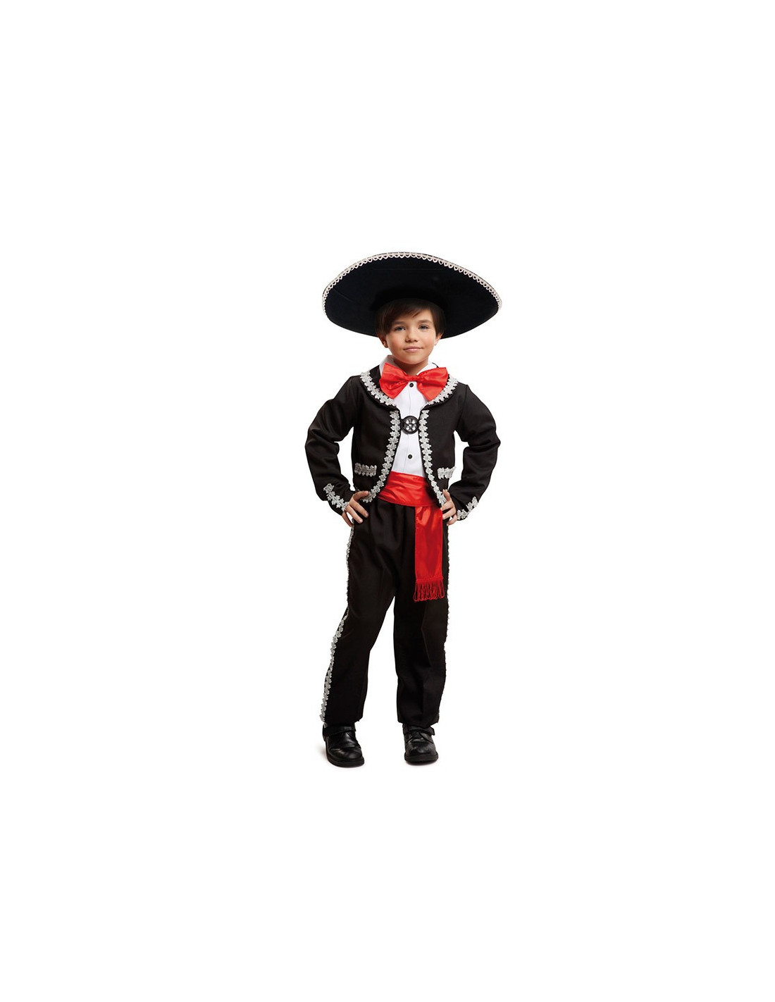 Este disfraz de mariachi para niño está compuesto por chaqueta negra con detalles, pajarita roja, fajín rojo y pantalones negros.
