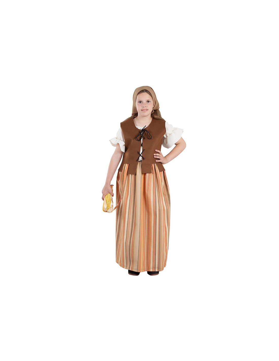 El disfraz de mesonera medieval infantil contiene una blusa, chaleco, falda larga y pañuelo para la cabeza.