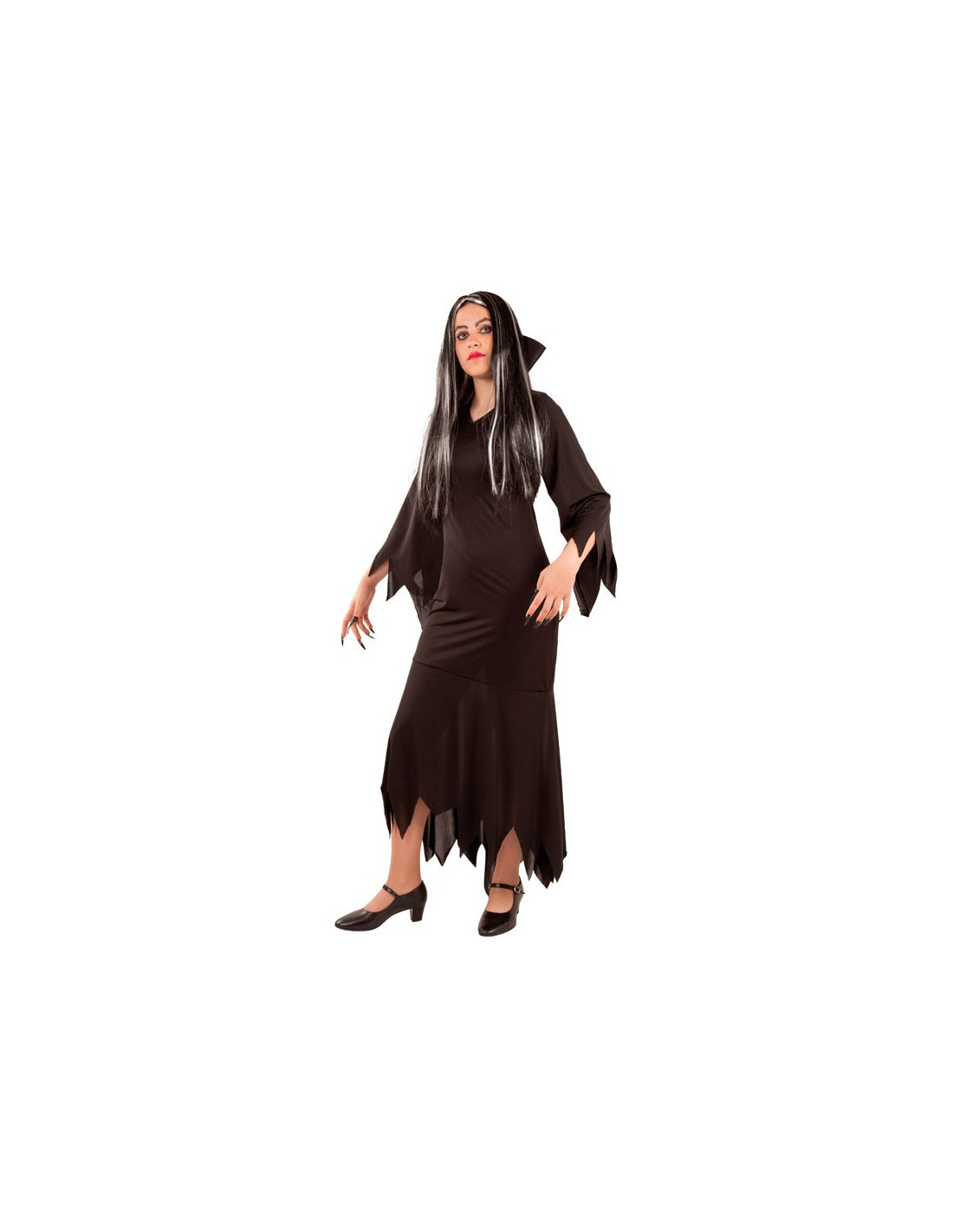 Este disfraz de Morticia para mujer contiene un vestido negro largo de lycra acabado en pico.